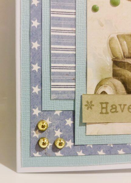 Blått är flått och det passar ju ett pojkkort perfekt i färgskala, men även lite små detaljer i grönt och guld fick det också bli.