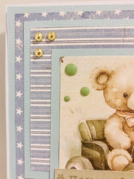 Det mönstrade pappret kommer från Maja design och jag har använt mig av båda sidorna med olika mönster, och bilden på nalle kommer från Reprint.