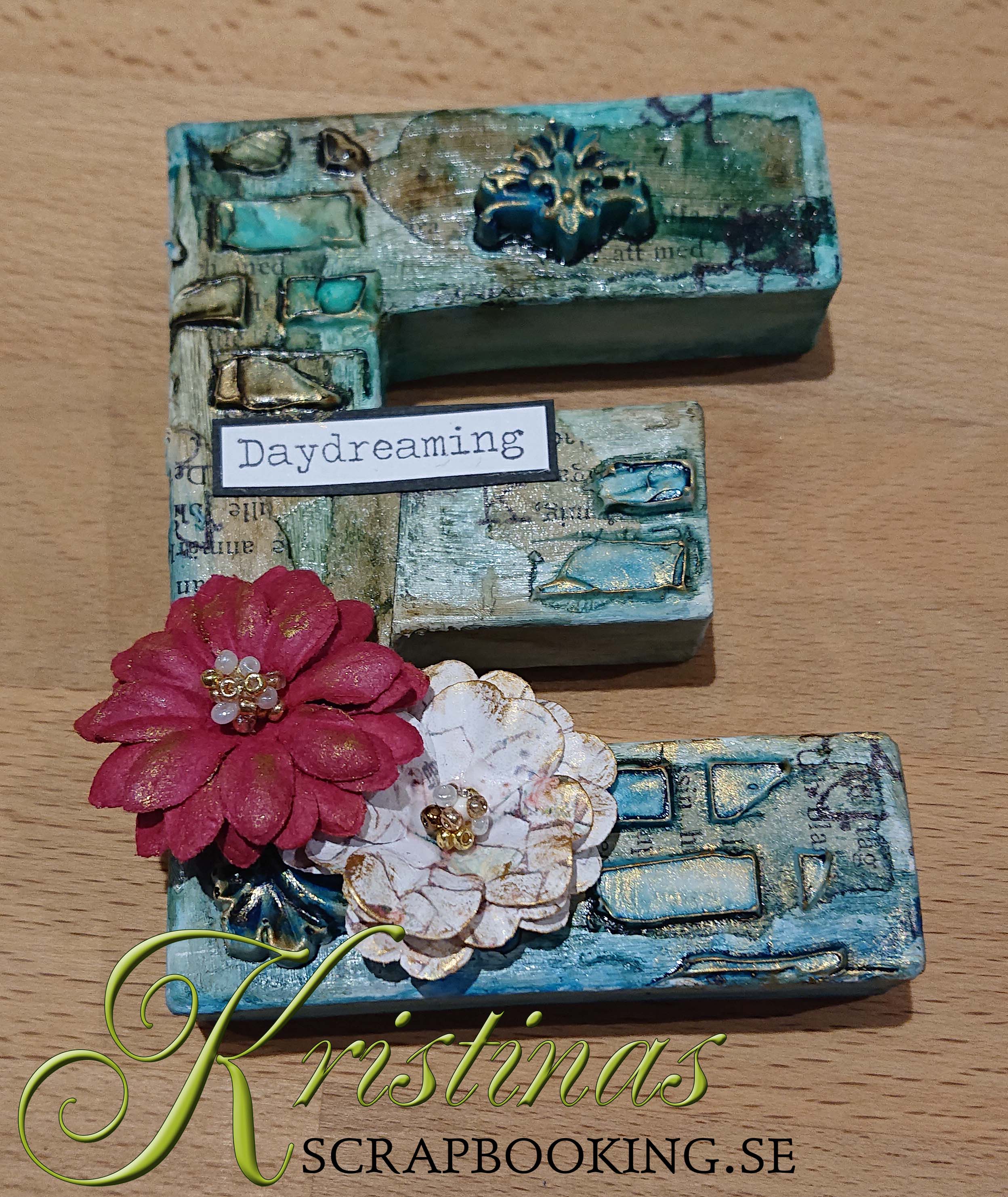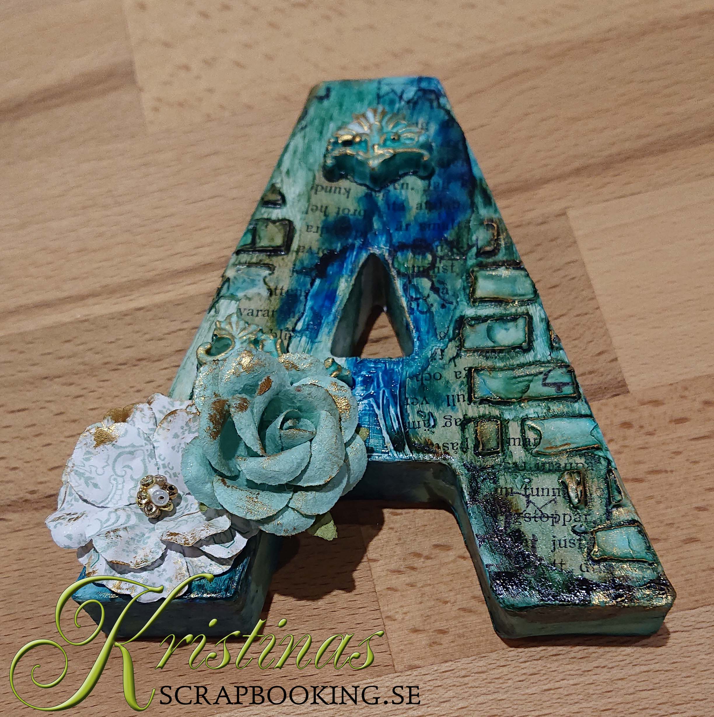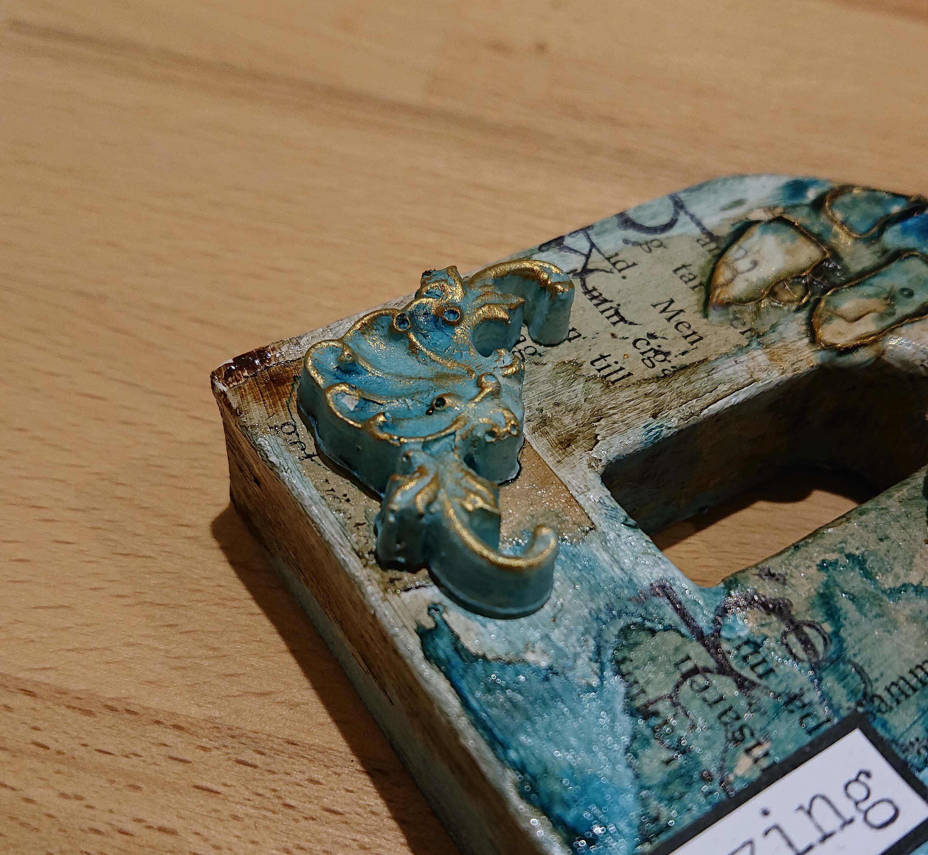 När modeling pasten torkat målades bokstäverna med liquid acrylic färger. Därefter stämplade jag med en svart vattenfast stämpeldyna på siffror, på lite olika ställen där jag kände att det behövdes något.