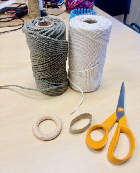Jag började med att klippa en liten bit av en toarulle som fick bli stommen till mössan. Sedan fäste jag makramégarn runt hela biten med lärkhuvudsknutar tills den var helt täckt och fick en härlig mössform.