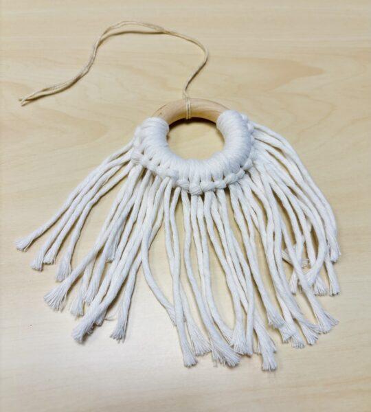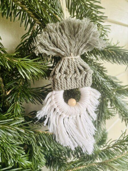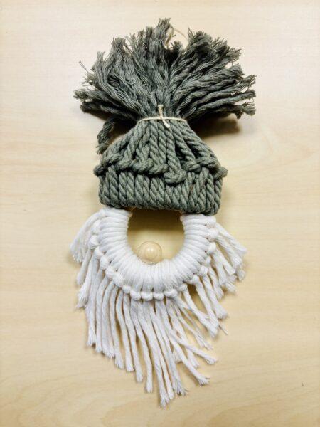 Därefter var det dags för tomtens skägg. Det knöt jag fast på samma sätt runt träringen. När skägget var klart limmade jag dit en liten träpärla som näsa med limpistol och fäste mössan ovanpå ringen. Innan jag limmade fast mössan trädde jag igenom en liten tråd i toppen, så att tomten går att hänga upp i granen.