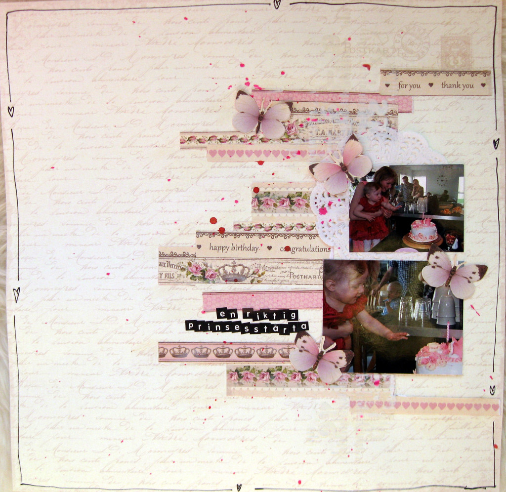 Runt layouten har jag ritat med svart penna och titeln är skriven med KaiserCrafts stickers-bokstäver. Och… Höll på att glömma, ett tårtpapper bakom fotot, passar ju bra i tårt-temat 🙂