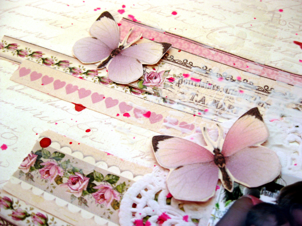 Alla bårder och även fjärilarna har jag klippt ur från det pappret. Sedan har jag strukit lite svagt med vit gesso över papperna. Pappret jag har till bas är också ett papper från Pion Design som heter A Day in May- Writings.