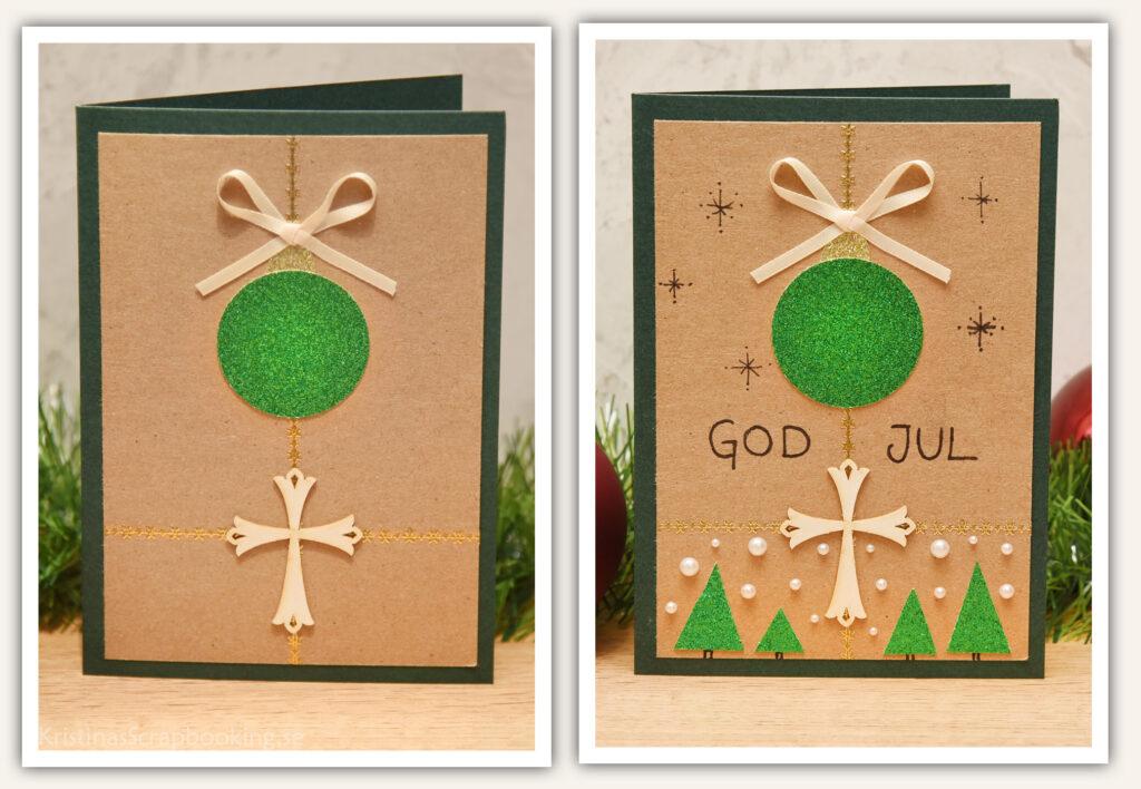 Första bilden ovan visar basen med utstansad julkula i glitterpapper, rosett, guldbårder av stickers och ett dekorativt kors av chipboard. På andra bilden har jag lagt till granar (utklippta från spillbitar), självhäftande halvpärlor och texten ”God Jul”.