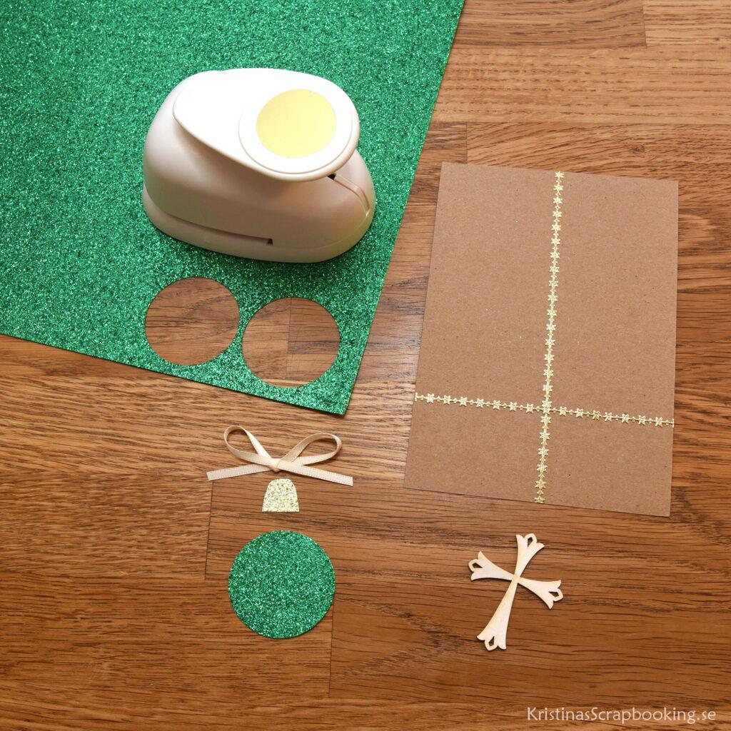 3. Stansa ut en julkula med cirkelstans. Bind en rosett av creme-färgat sidenband och limma fast delarna med limstift på kortet.