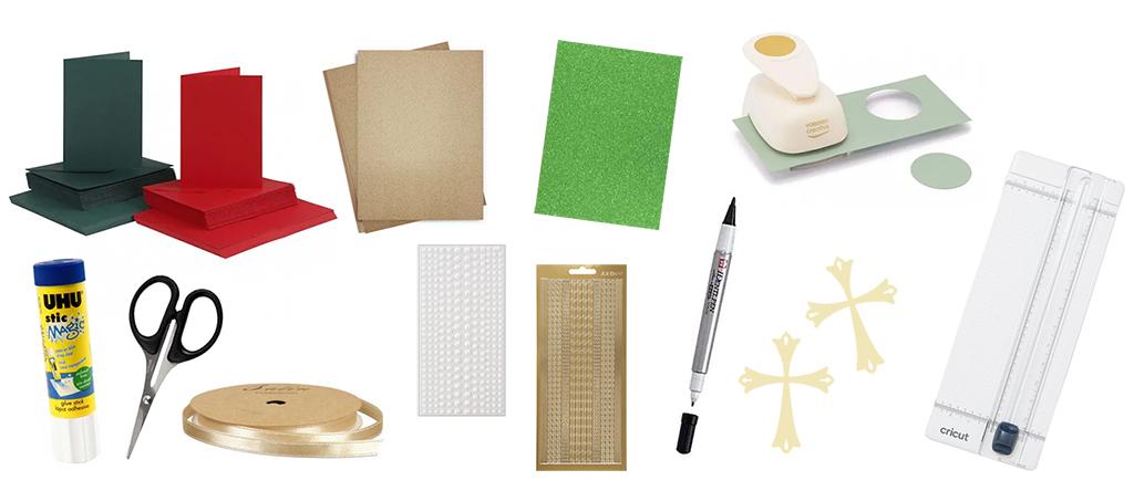 Vi använder färdiga dubbelvikta kort i A6-format, som finns att köpa i 50-pack. Man kan också skära ut egen kortbas av 200 g kartong i rött eller grönt med måtten 10,5 x 15 cm.