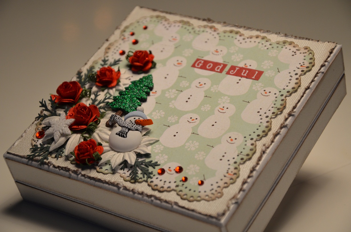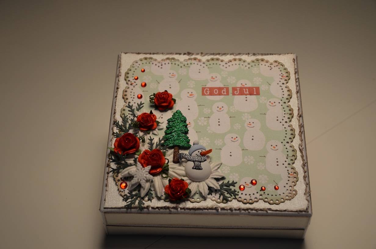 Dom dekorationer har jag använt mig av 2 olika storlekar på röda rosor, vita blommor från Reprint och utstansade kvistar från ännu en Martha Stewart punch. Den söta knappar snögubben, granen och snöflingan hittar ni självklart i butiken. En sista piff med rhinestones silver, rött stickles glue och en hälsning om God Jul gjorde asken perfekt.