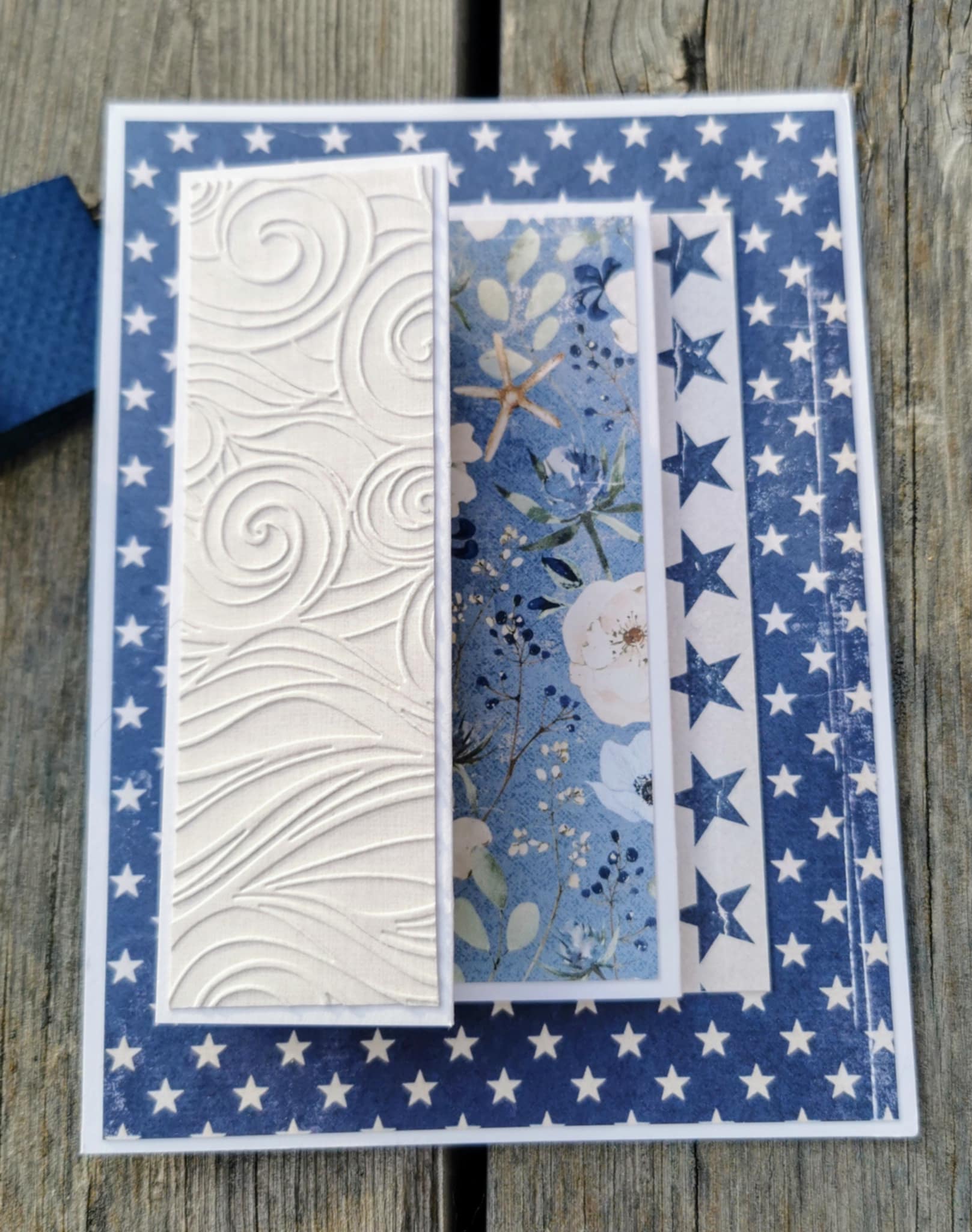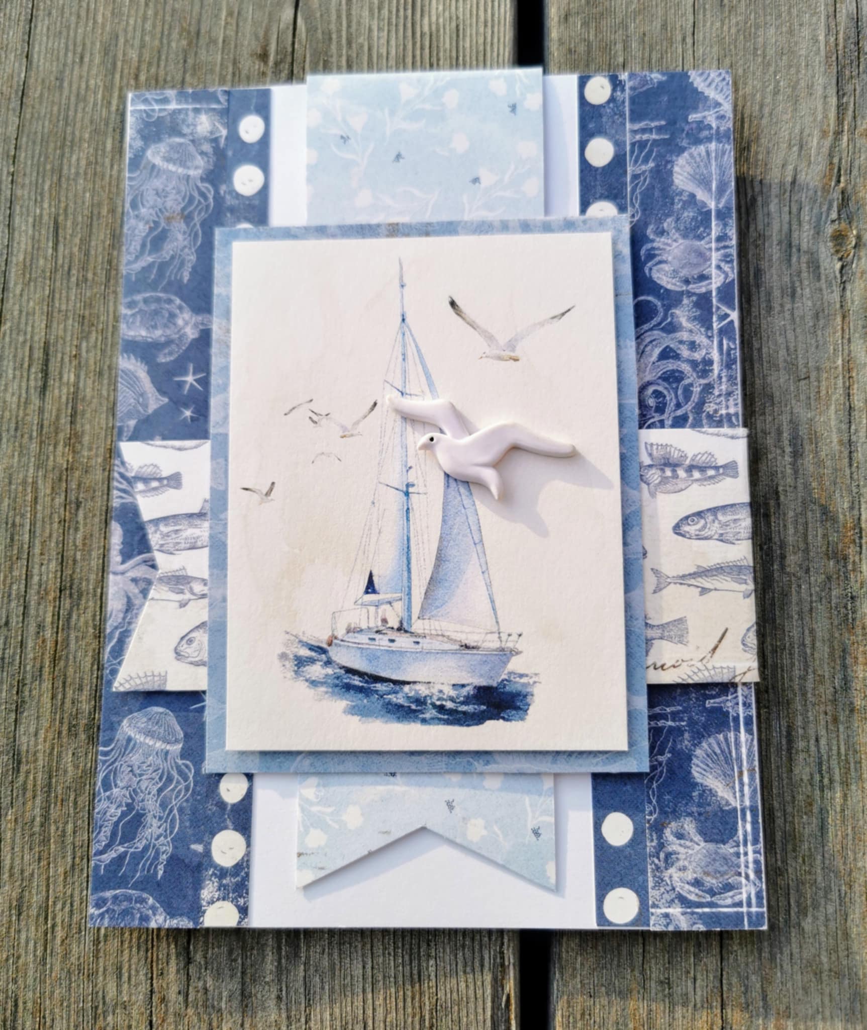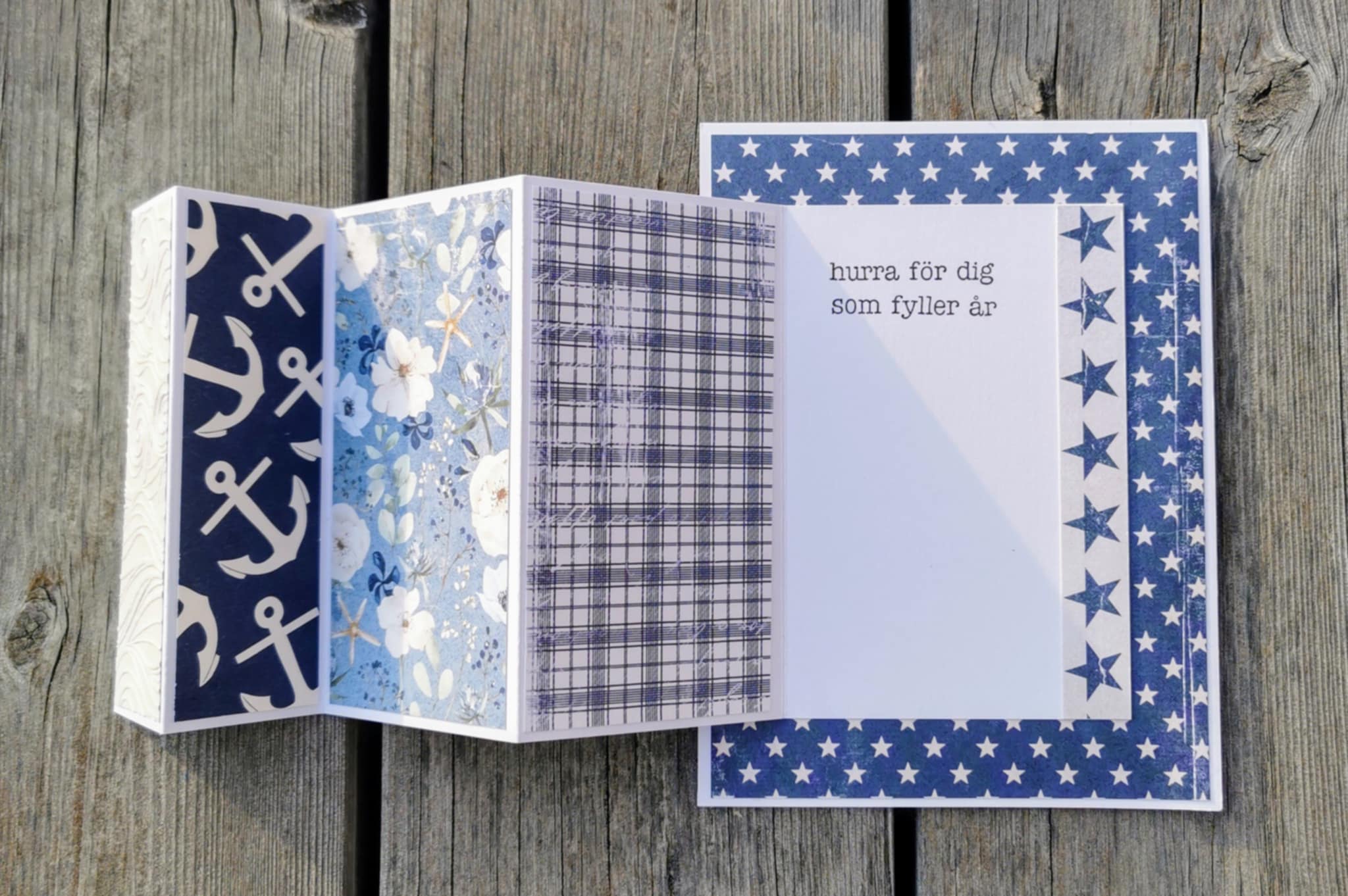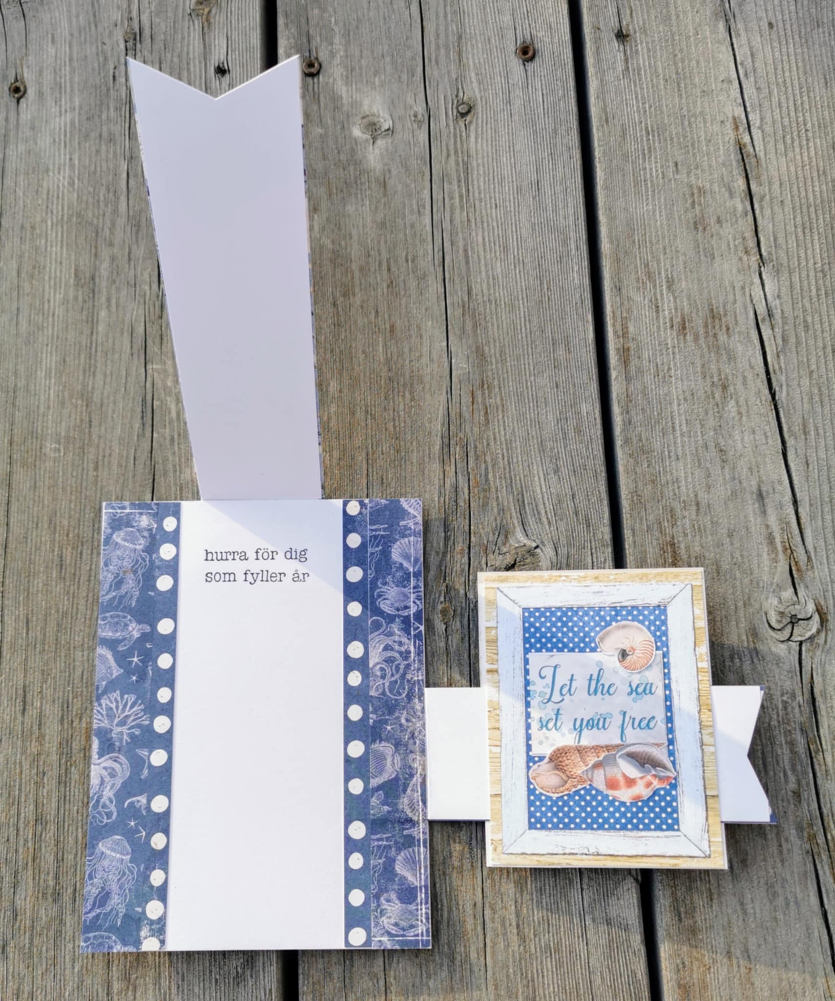 Första kortet är uppbyggt av ”flärpar” i lager som man viker upp för att öppna upp kortet. En mås som dekoration är en rolig detalj som gör det platta kortet något mindre platt…