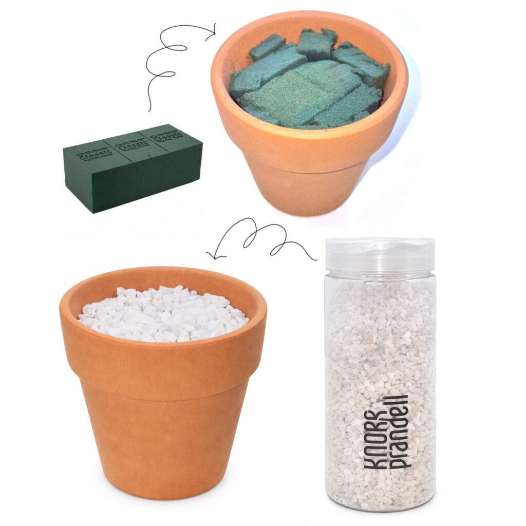 Nästa kruka lät jag vara omålad och dekorerade bara. Jag började med att fylla krukan med oasis och hällde sedan på vit dekorsten.