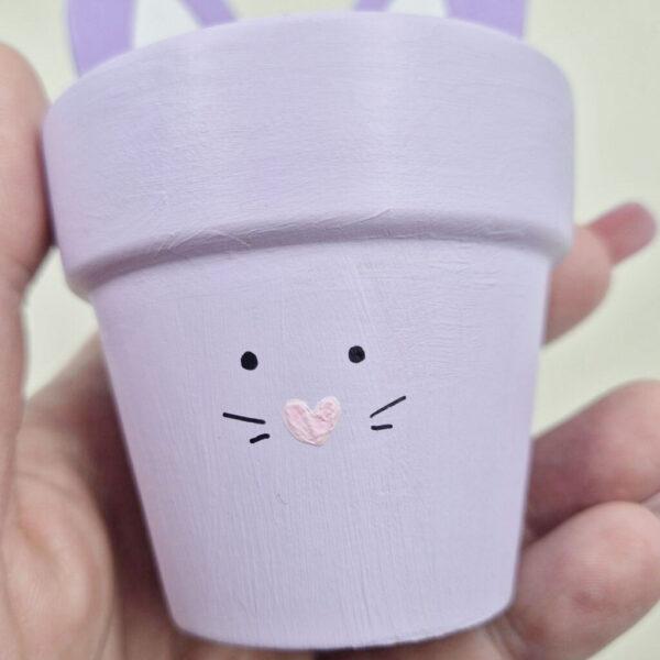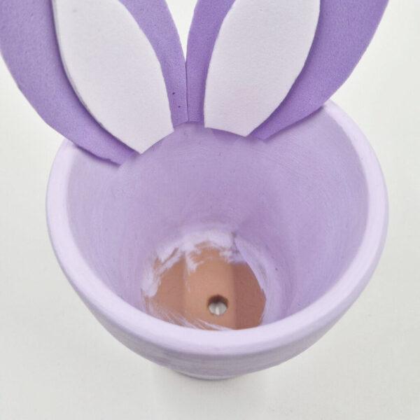 Jag målade terrakottakrukan lila. Det räckte med två lager för att få en fin täckning. Öronen är gjorda i dekorgummi. Jag limmade fast öronen en bit ner på insidan med favoritlimmet Tacky Glue Turbo av Aleene’s.
