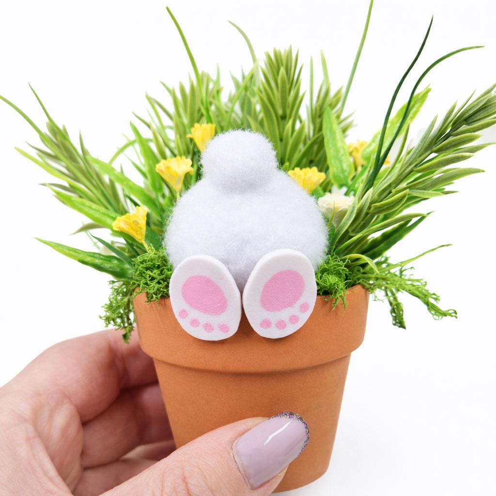 Supersöt kruka med en liten vit kaninrumpa som sticker upp ur gräset.