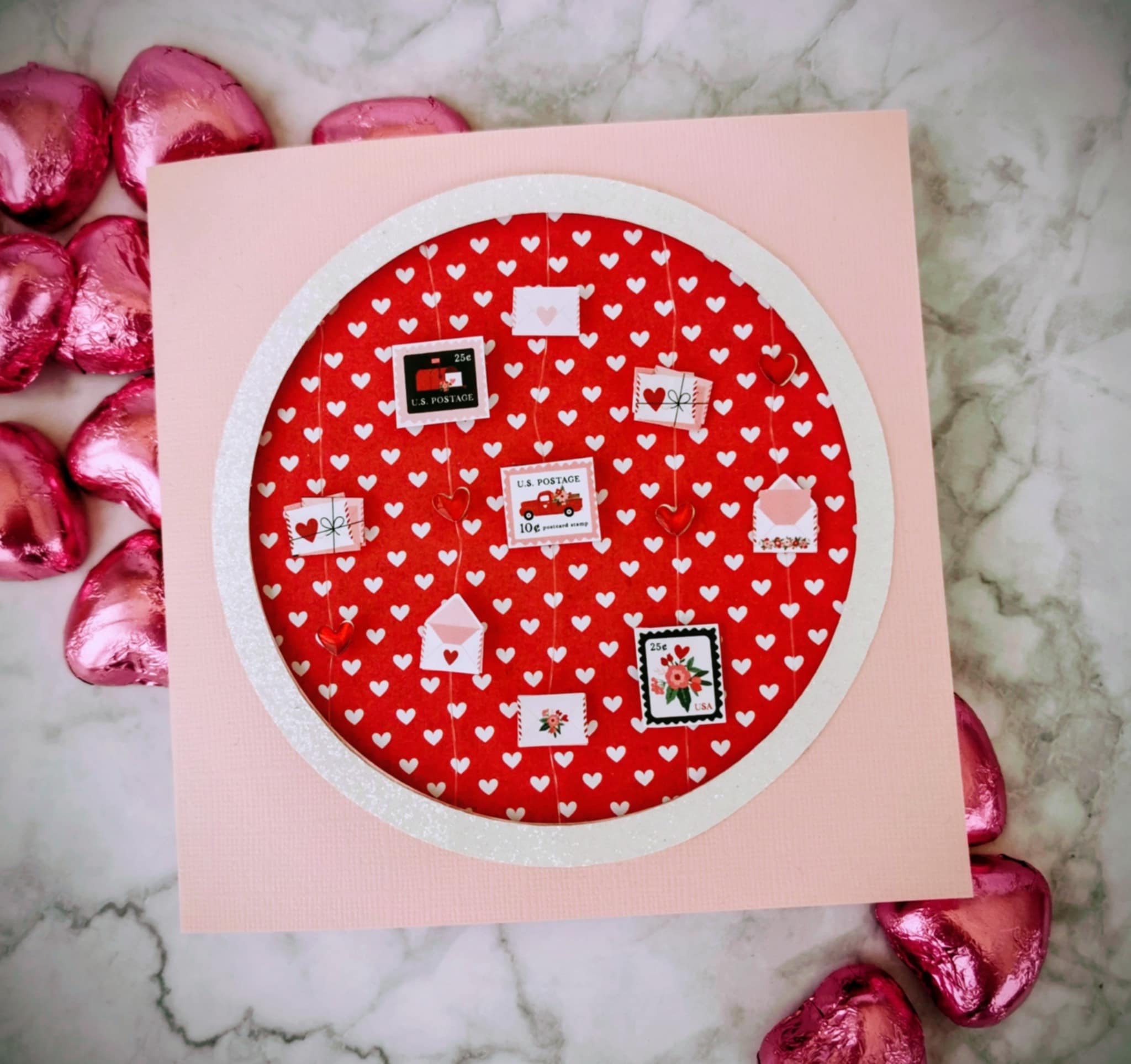 Ett kort skapat med enkla medel: cardstock, designpapper med lite kärlekstema (Echo park), glitterpapper