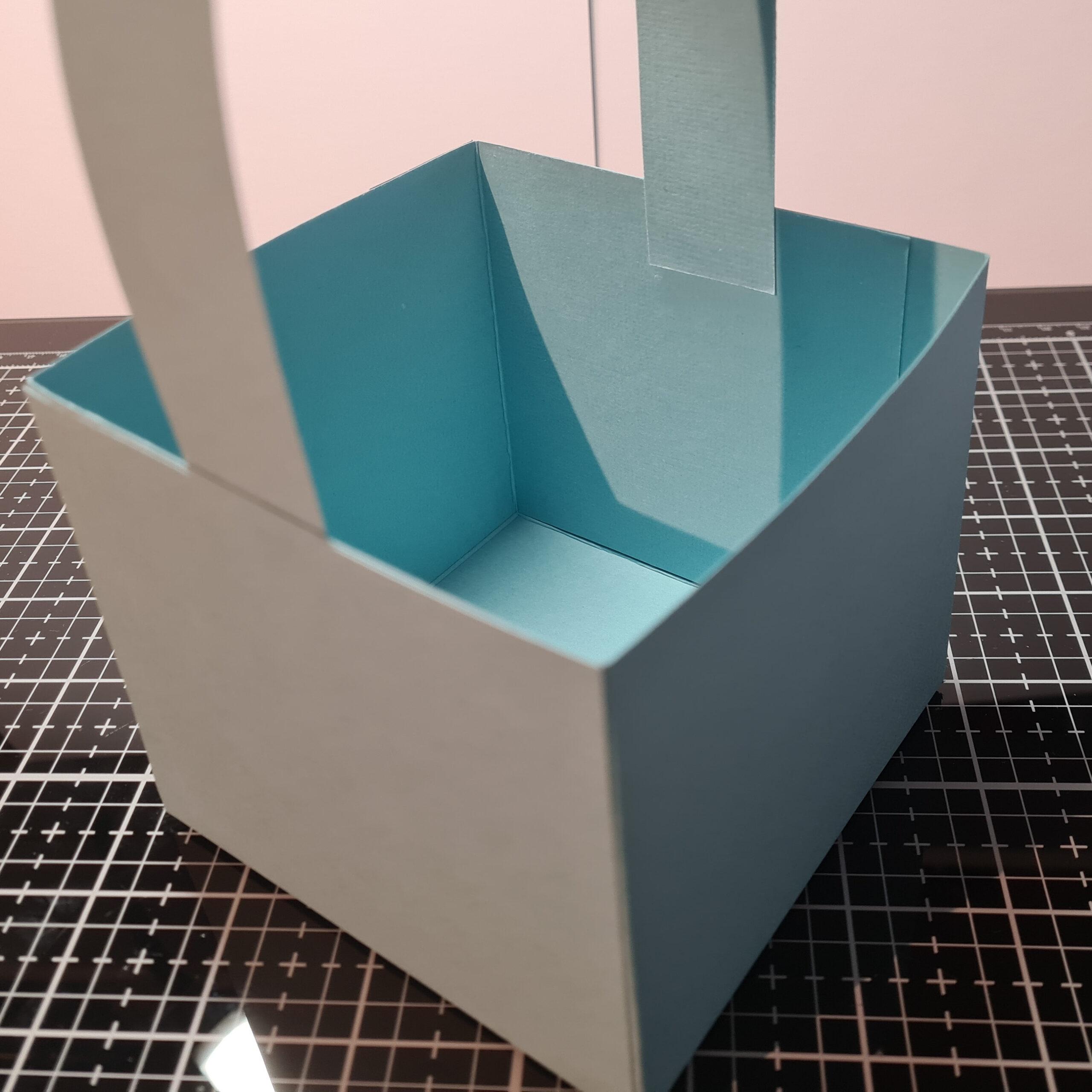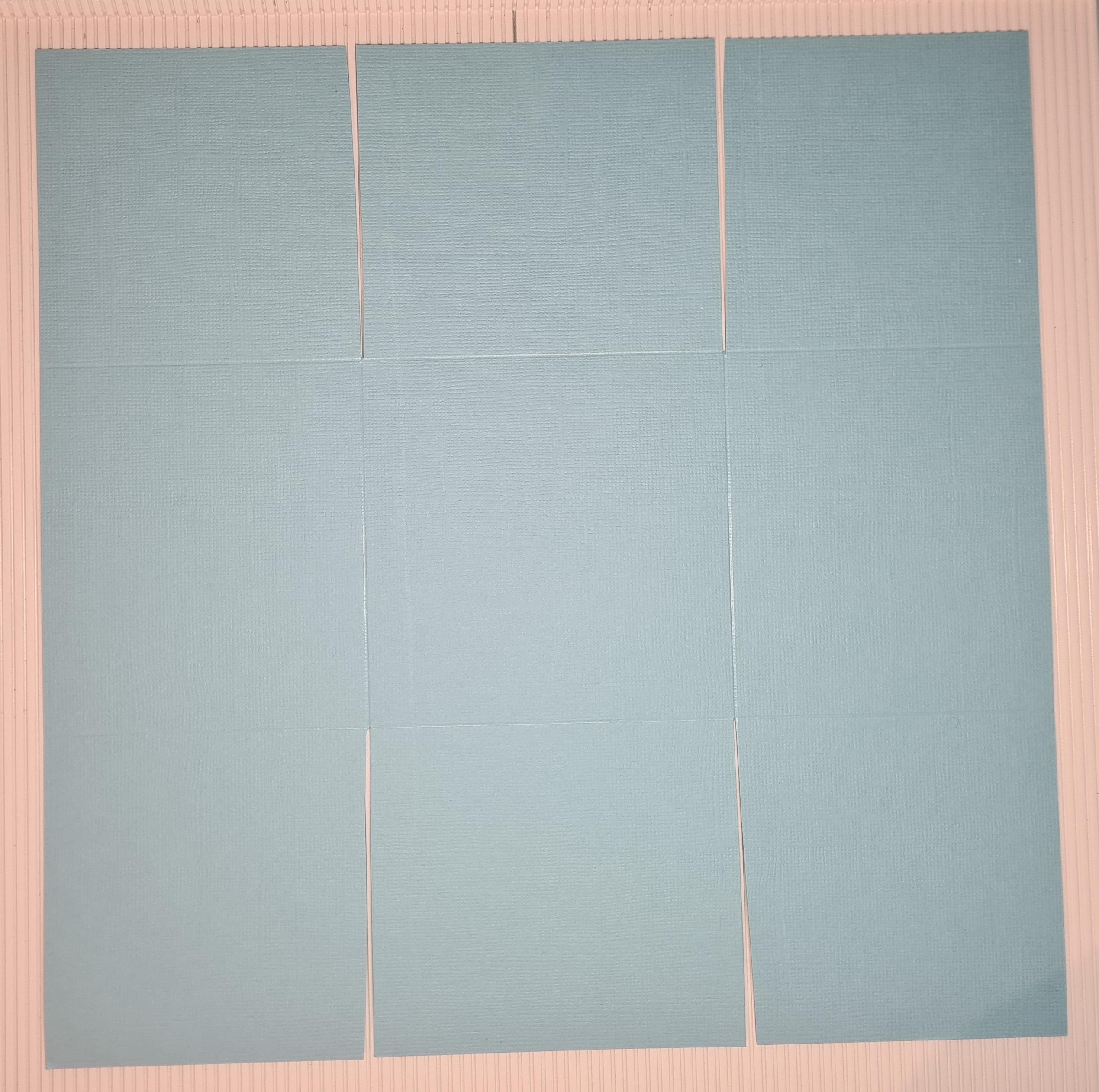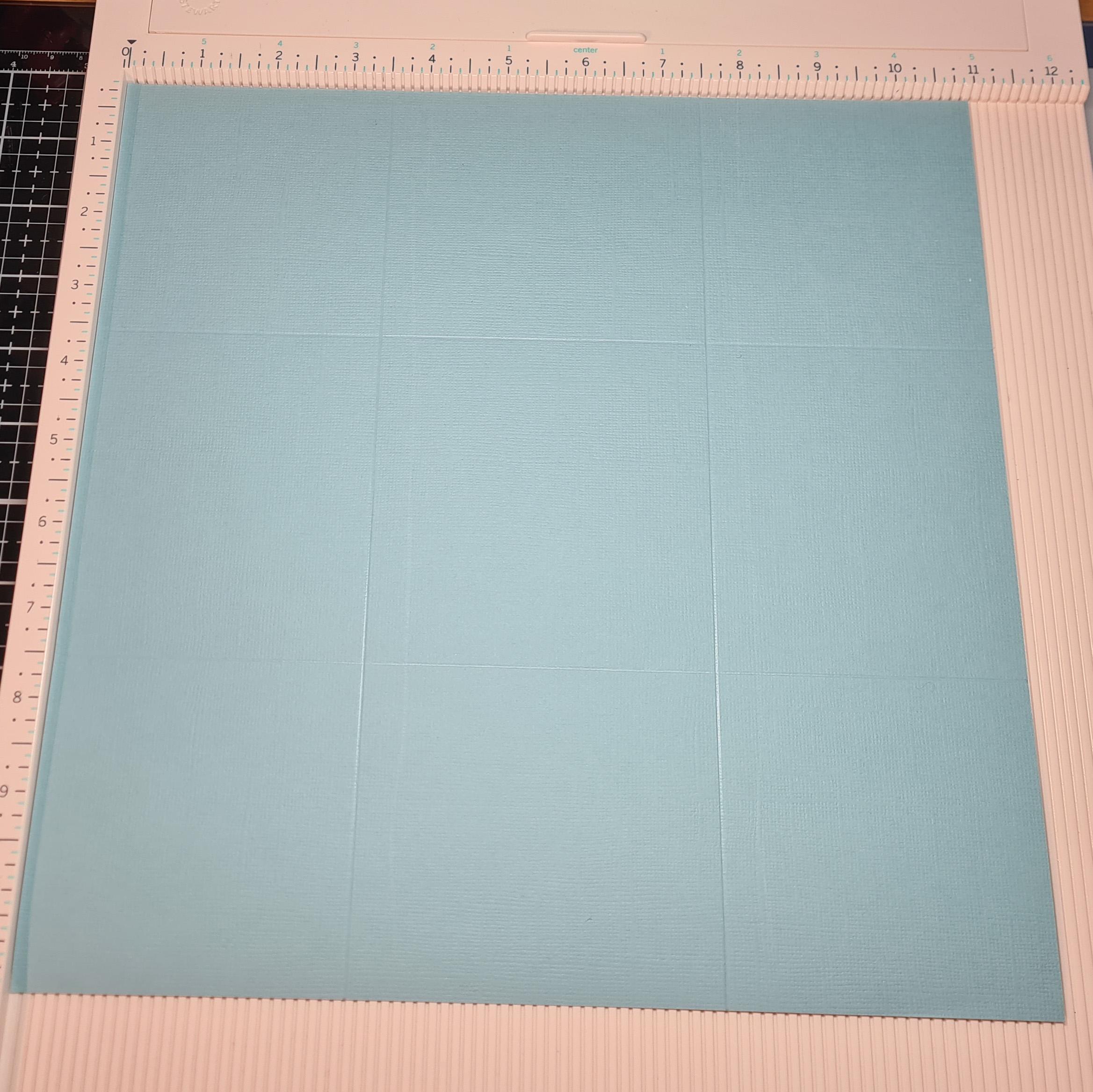 För att göra korgen behöver du ett cardstock som mäter 11 x 11 inch. Biga på 3 ½ och 7 ½ inch, vänd stedan ett kvarts varv och biga på samma mått igen.