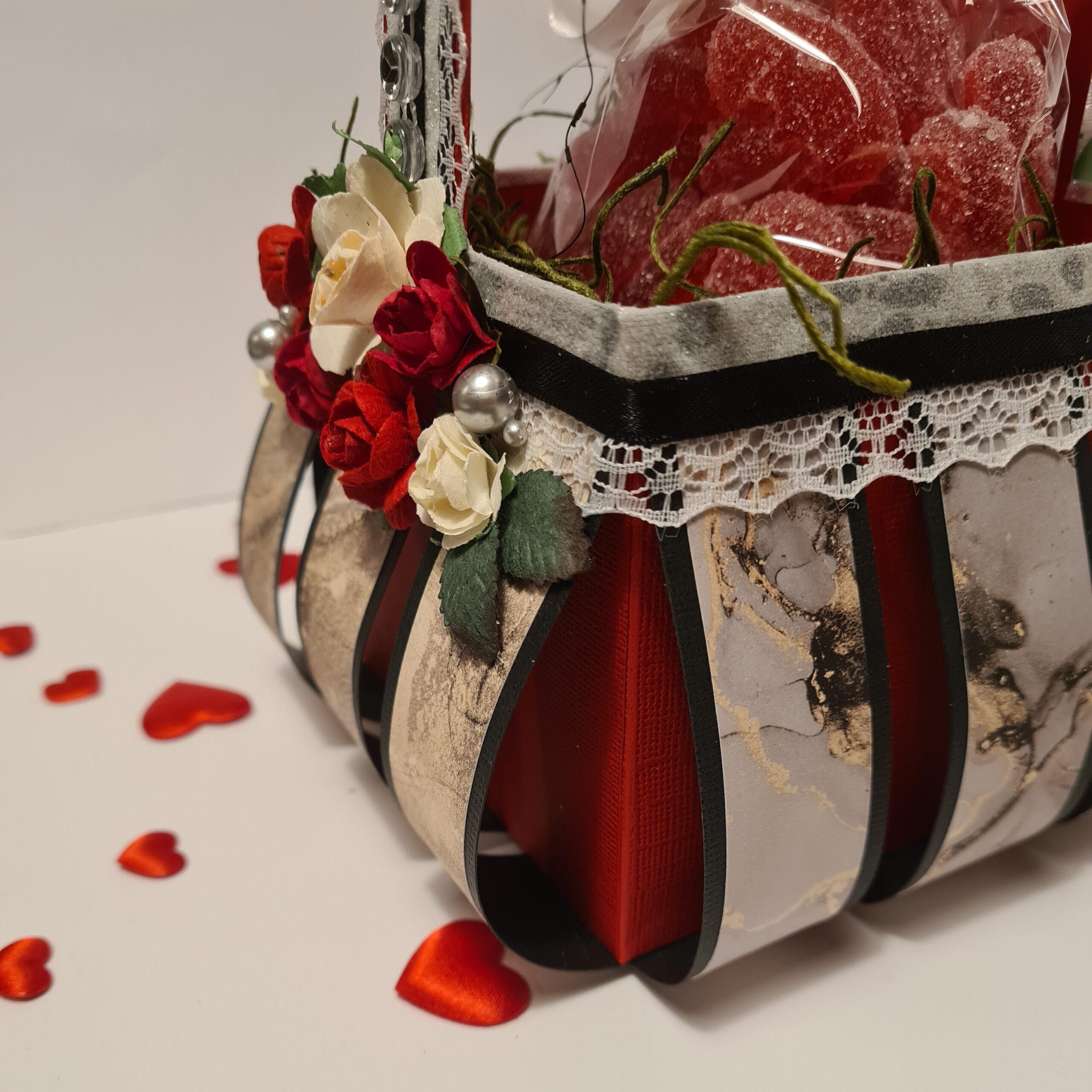 Nu närmar vi ju oss Alla hjärtans dag med stormsteg. Du har väl inte missat att det finns mängder med fina papper och dekorationer hos Kristinas? Idag visar jag en korg som jag skapat för att kunna ge bort lite godis i. Korgen går att fylla med mycket! Den är 3 ½ inch djup och sidorna är 4 inch. Jag ville ha lite dekoration runt mitt godis i min korg också så jag la i lite djungelgräs.