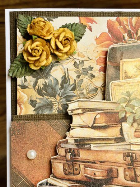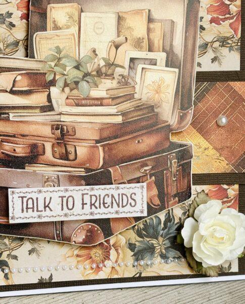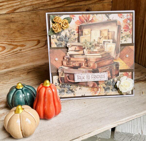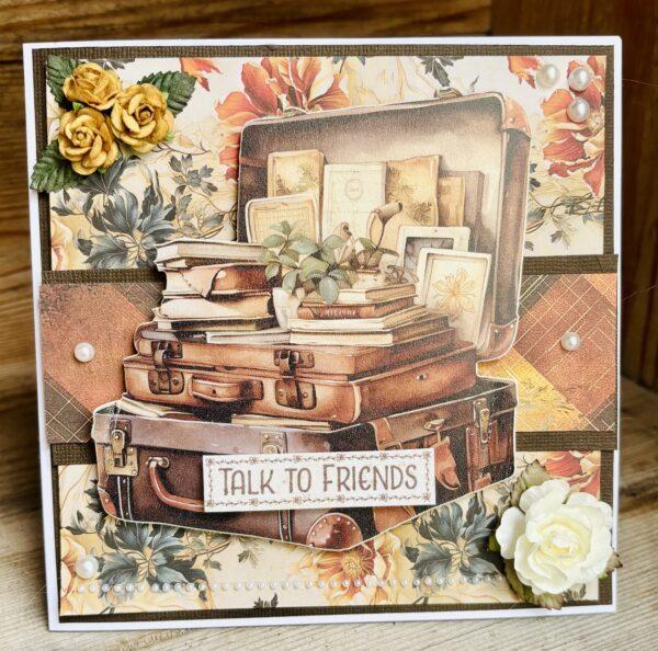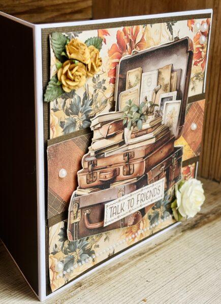 Jag valde motivet eftersom jag älskar gamla resväskor och har flera som pryder hemmet, de har en särskild charm. För att ge djup och lyfta fram motivet fäste jag det med 3D-kuddar.