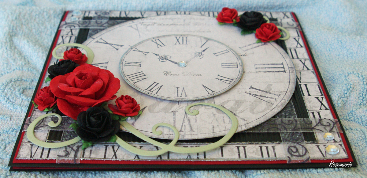 Till bas har jag använt cardstock i färgerna svart och rött. Mönsterpappret är fram- och baksidan på Den Oersättliga Tiden från kollektionen Crea Diem. Jag använde också svart wellpapp bakom klockorna. Alla kanter har blivit embossade med silverfärgat embossingpulver.