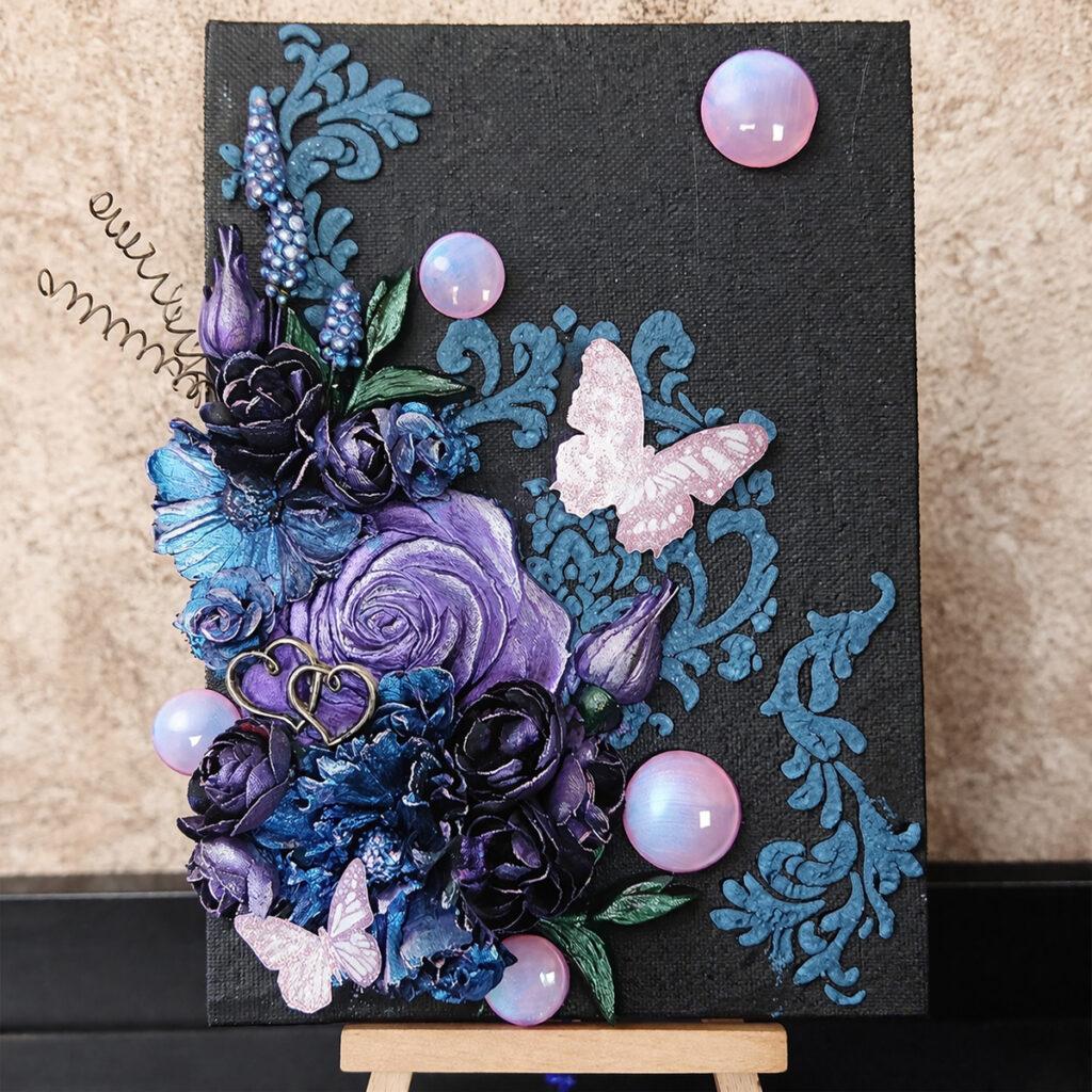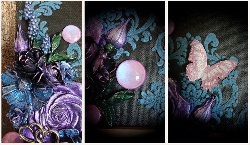Jag har tillverkat rosor och knoppar av Stamperias lufttorkande lera. De flesta kommer från setet Butterflies and Flowers i Stamperias serie Secret Diary. Både blommorna av lufttorkande lera och mina pappersrosor målades först med svart gesso och därefter med Inka Gold och metallisk akrylfärg. För att detaljerna skulle framträda mer avslutade jag målandet med att lägga till Inka-Gold Rosenquartz på topparna.