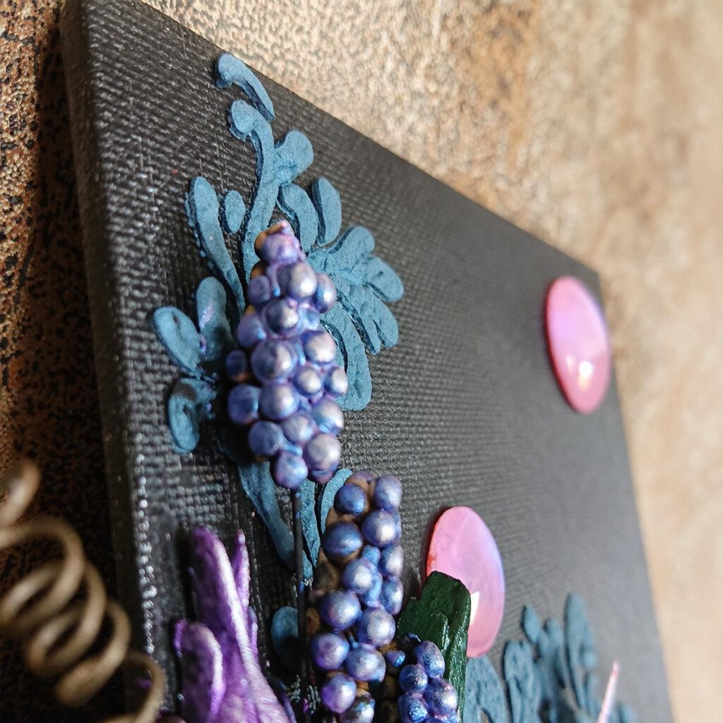 Denna vecka bjuder jag på en mixed media tavla, målad och dekorerad i lila och turkos på målarplatta i A4. Grundmålad med svart gesso.