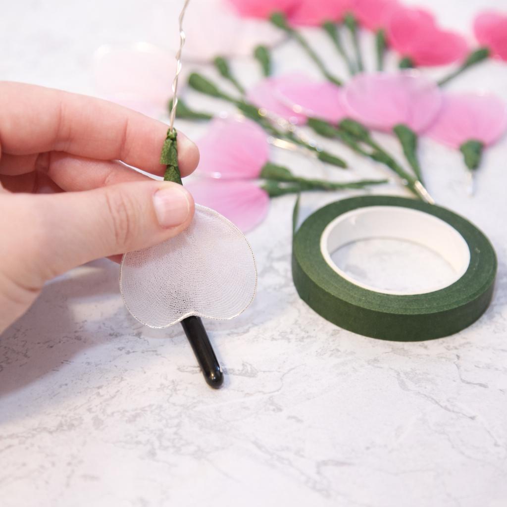 4. Klä den del av metalltråden som ska bli stjälk med grön blomstertejp för ett naturligt utseende. Vira några varv. Tejpen fäster i sig själv utan att bli klibbig.