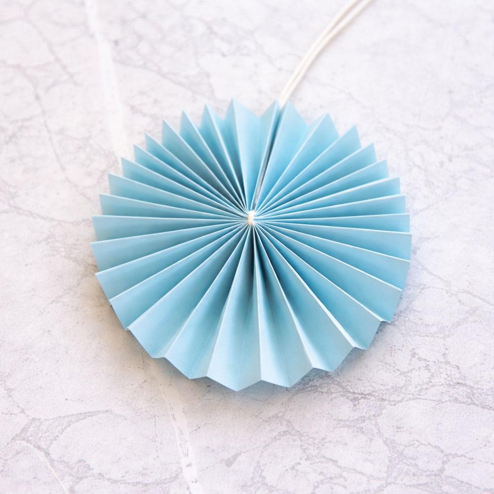 Jag började att tillverka en veckad rosett, genom att dela ett färgat A4 papper på mitten, ca 30 x 15 cm. Delarna vek jag som ett dragspel, likt bilden nedan visar.