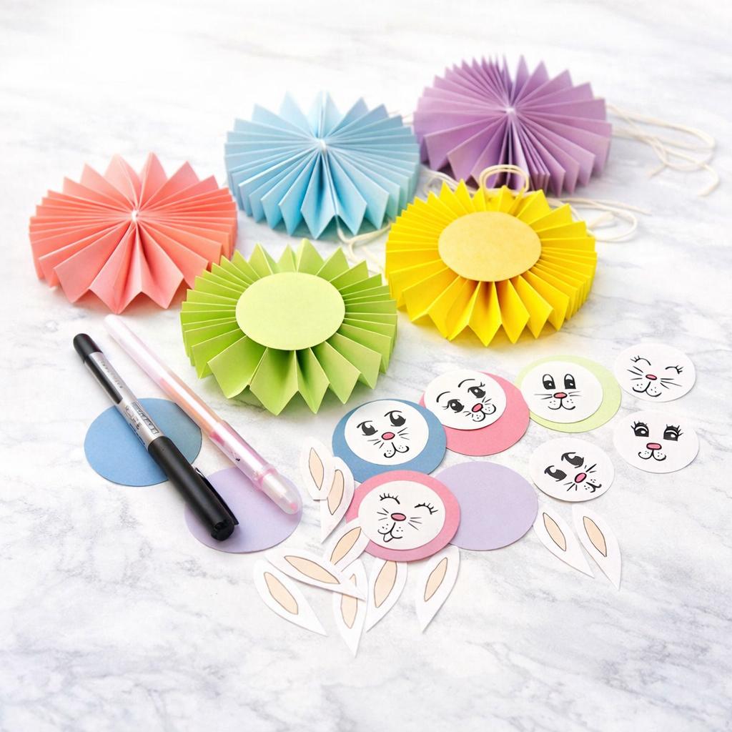 Påsken är runt hörnet och i helgen tillverkade barnen och jag årets påskris. Vi gjorde söta små kaniner av veckade papper, ungefär som en prisrosett.