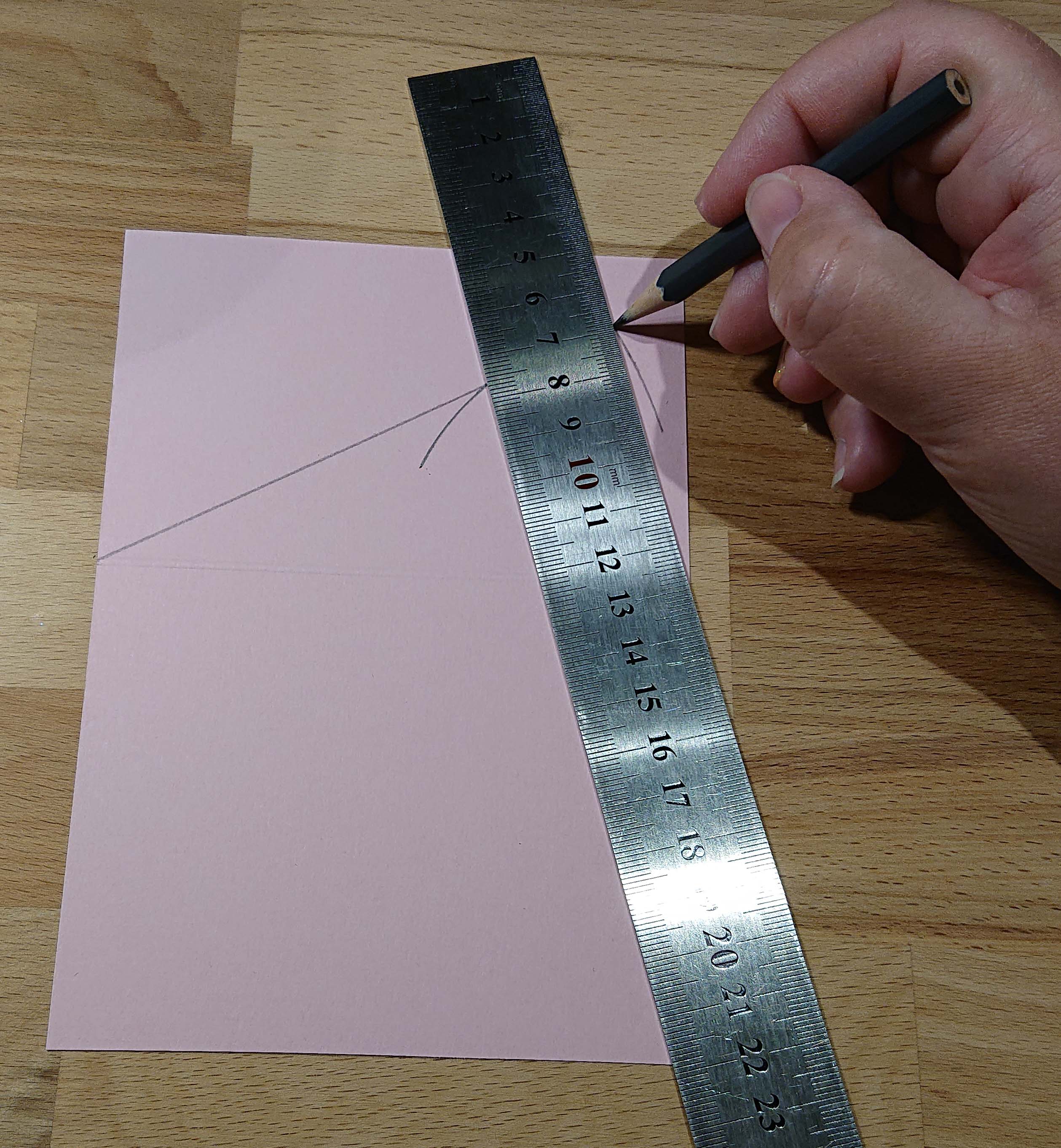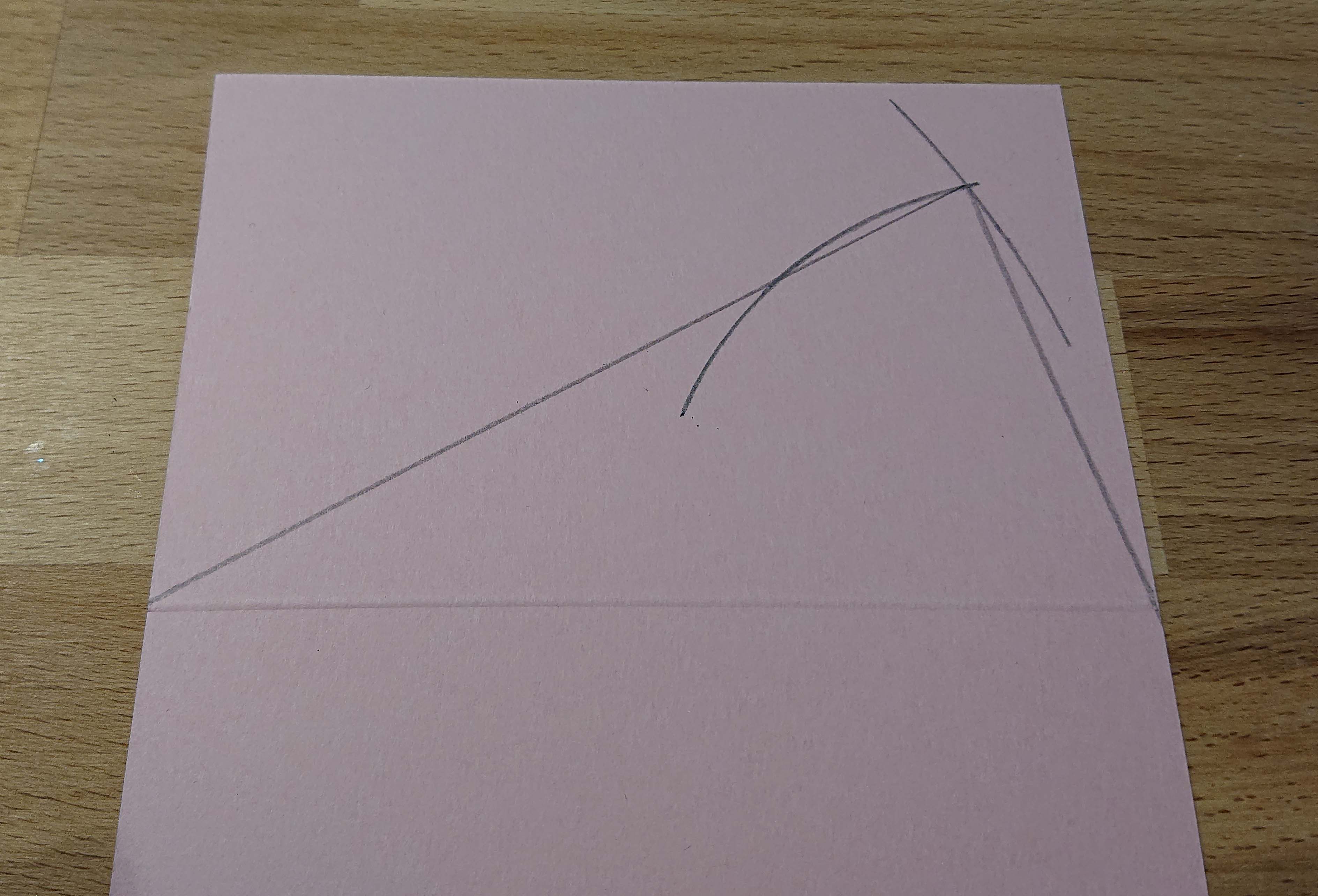 Sudda försiktigt bort dina båglinjer med ett suddigum och rita ett streck parallellt med det långa strecket. Rita sedan ett litet streck till hörnet där dina bågar möttes. Klipp längs med dina ritade linjer.