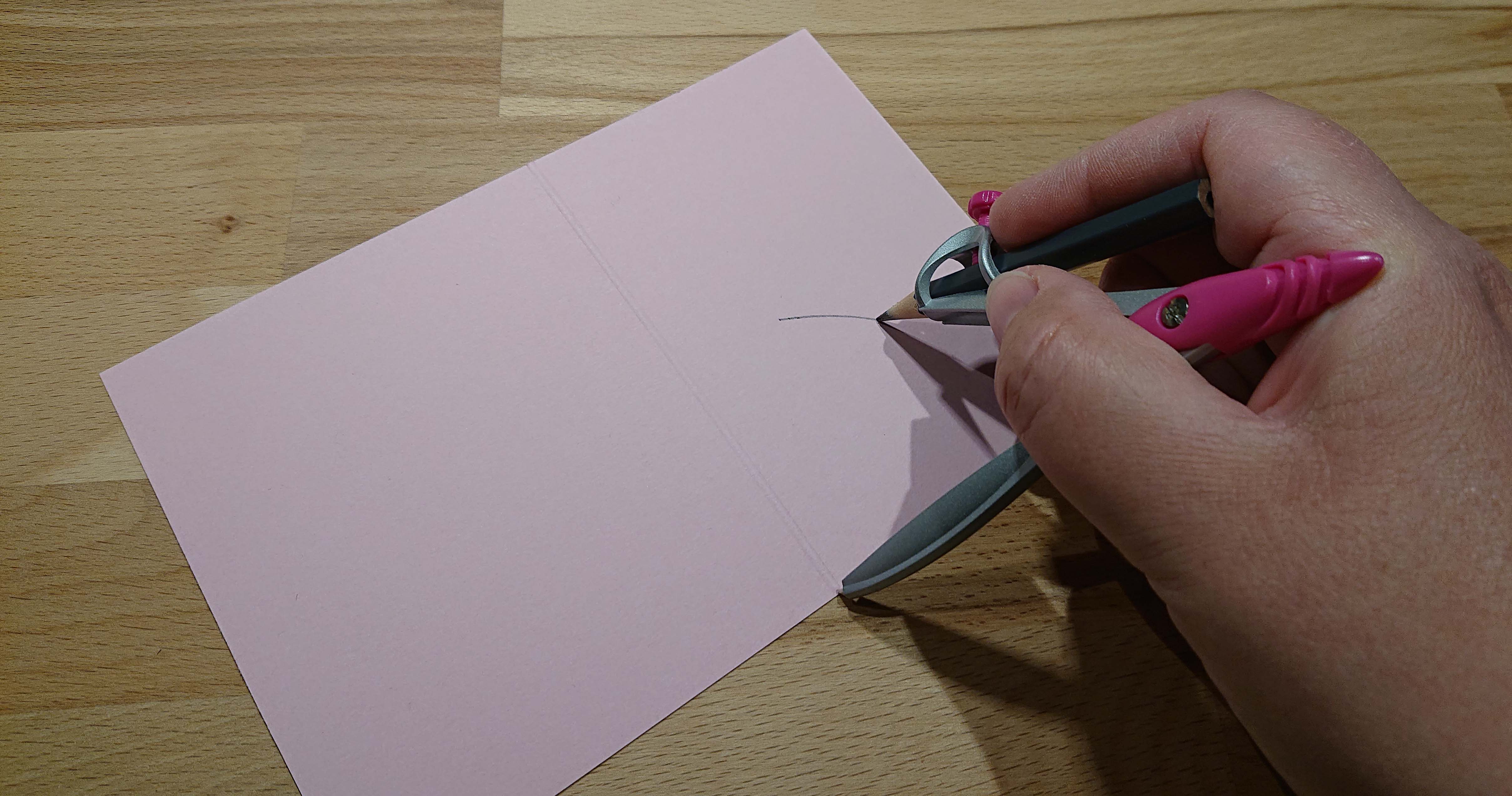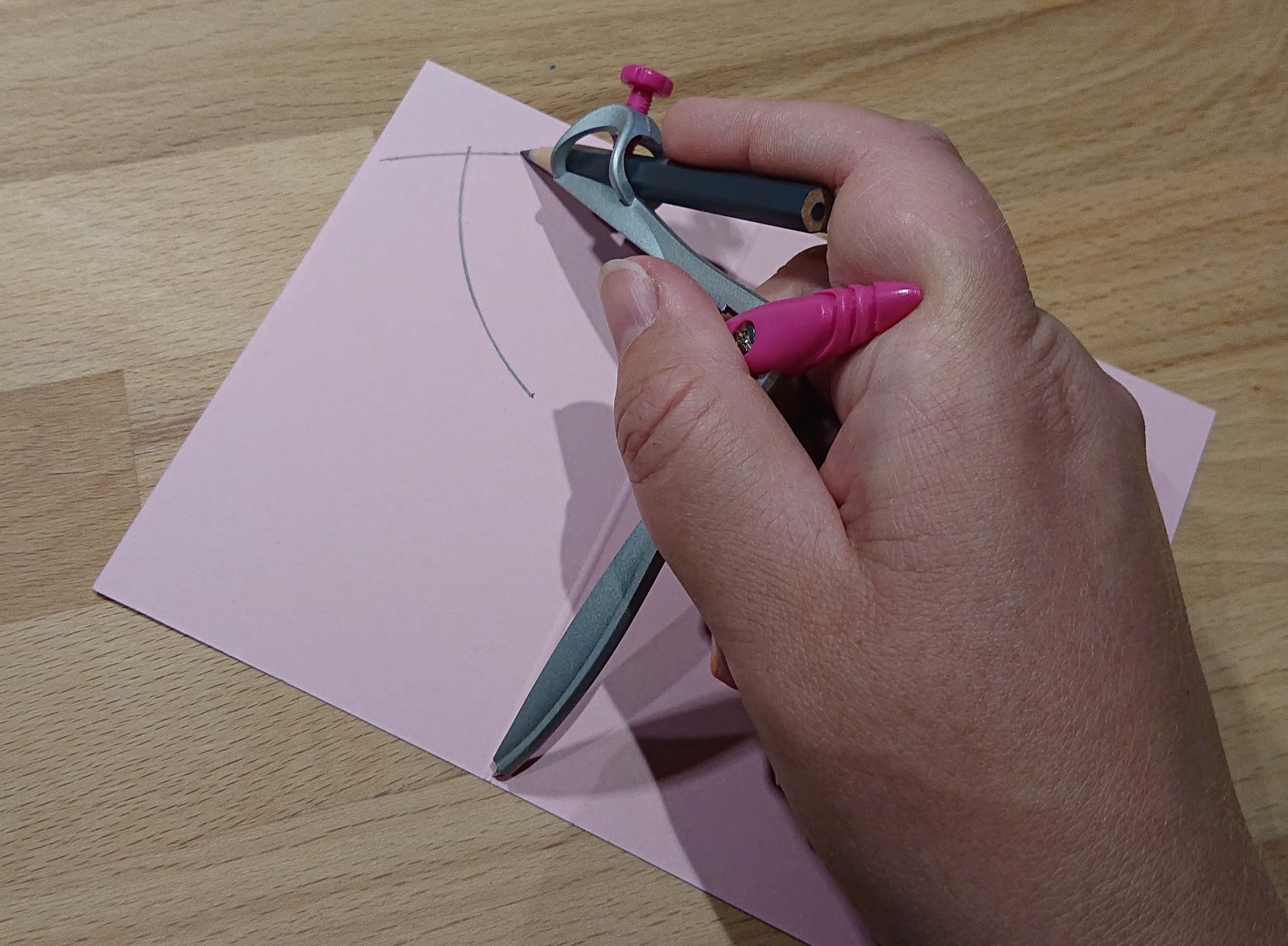 Nu behöver du använda dig av en passare. Börja med att mäta ut 6cm på passaren och gör en båge på den korta delen på cardstockbiten som ska bli ditt lock. Sedan mäter du upp 12cm på passaren och gör en båge från andra hållet. Nu får du en punkt på papperet där dina bågar möts.