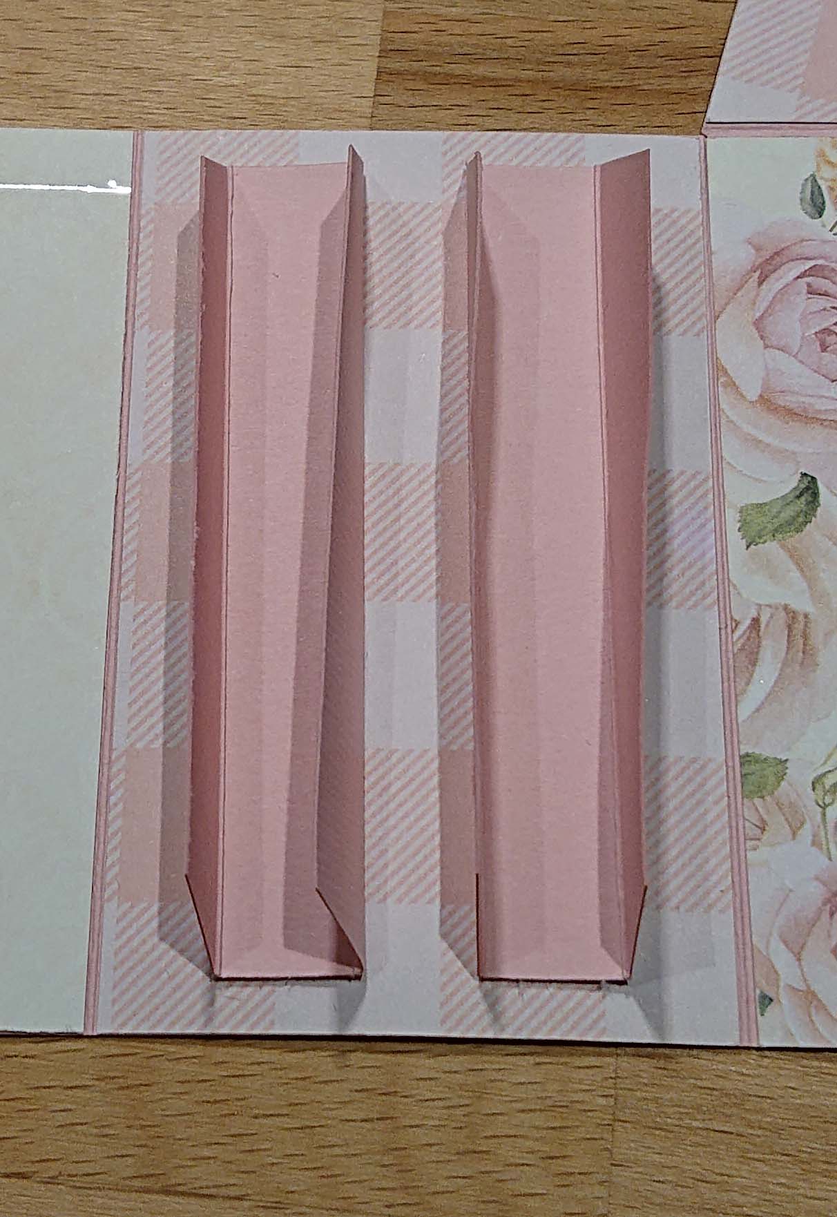 Tårtbiten är tänkt som ett album, men min plan är ju att det ska bli recept i den i stället. Så nu behöver du göra något att fästa dina blad i. Jag valde att ta två bitar som är 3.9 cm x 8,5 cm och biga dessa på 1,3 cm in från båda sidorna och sedan fästa i mitten på tårtbiten.