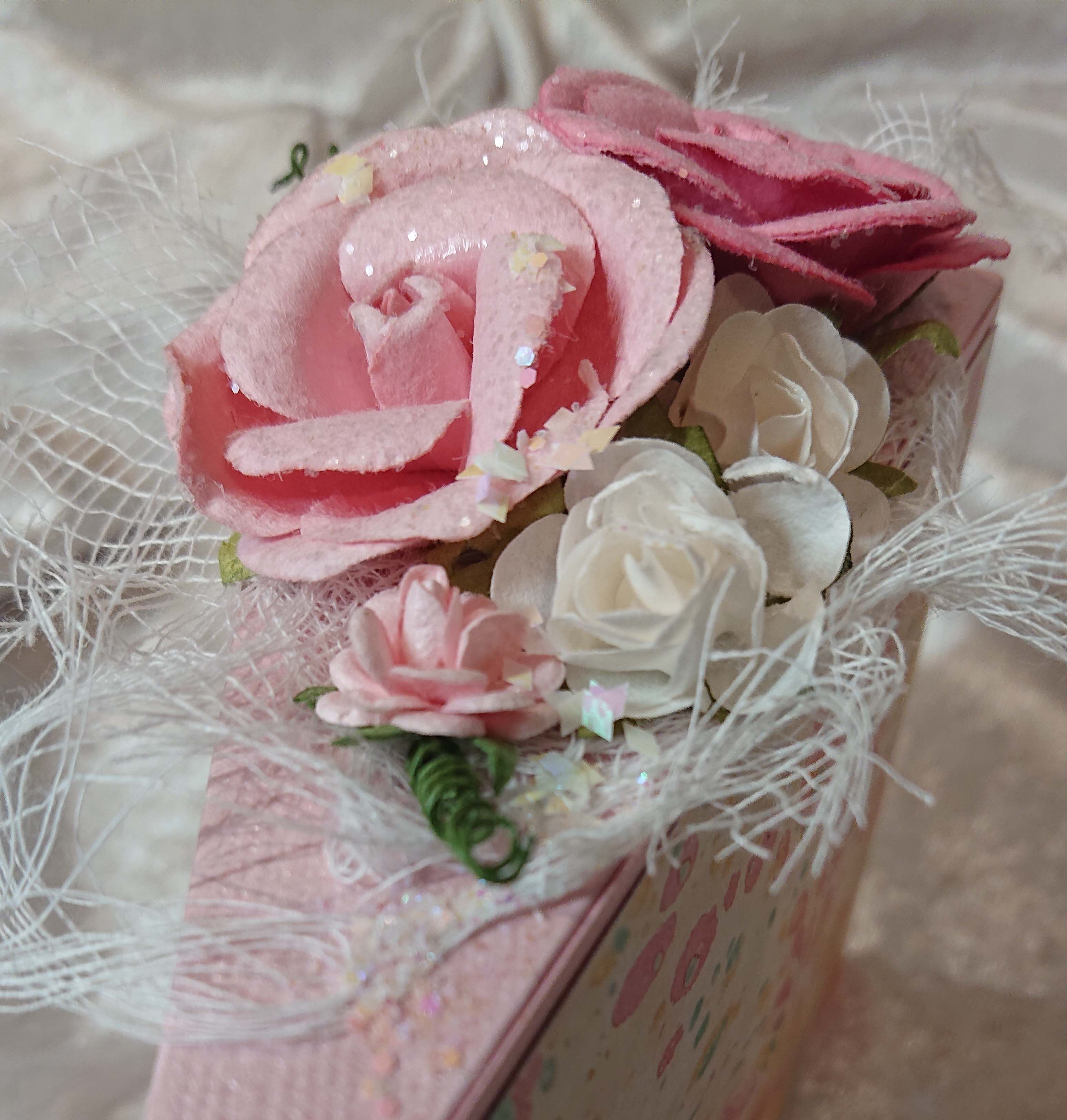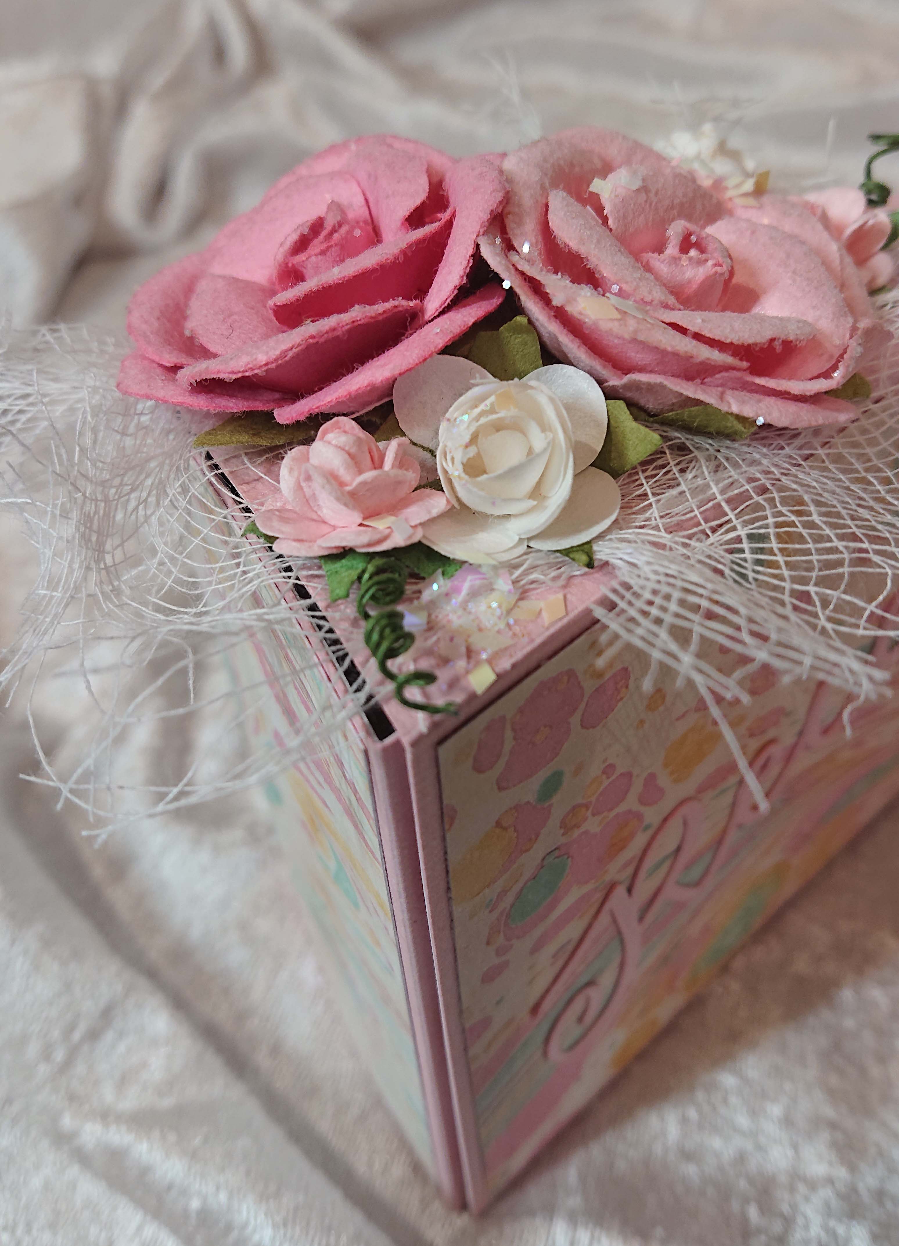 Därefter är det dags att fästa mönsterpapperet på utsidan. Du behöver två stycken bitar som är 11,5 cm x 9 cm och en som är 5,4 cm x 9 cm. Jag valde att bara ha mönsterpapper på sidorna och lämna locket som det är eftersom detta kommer att dekoreras med blommor senare.