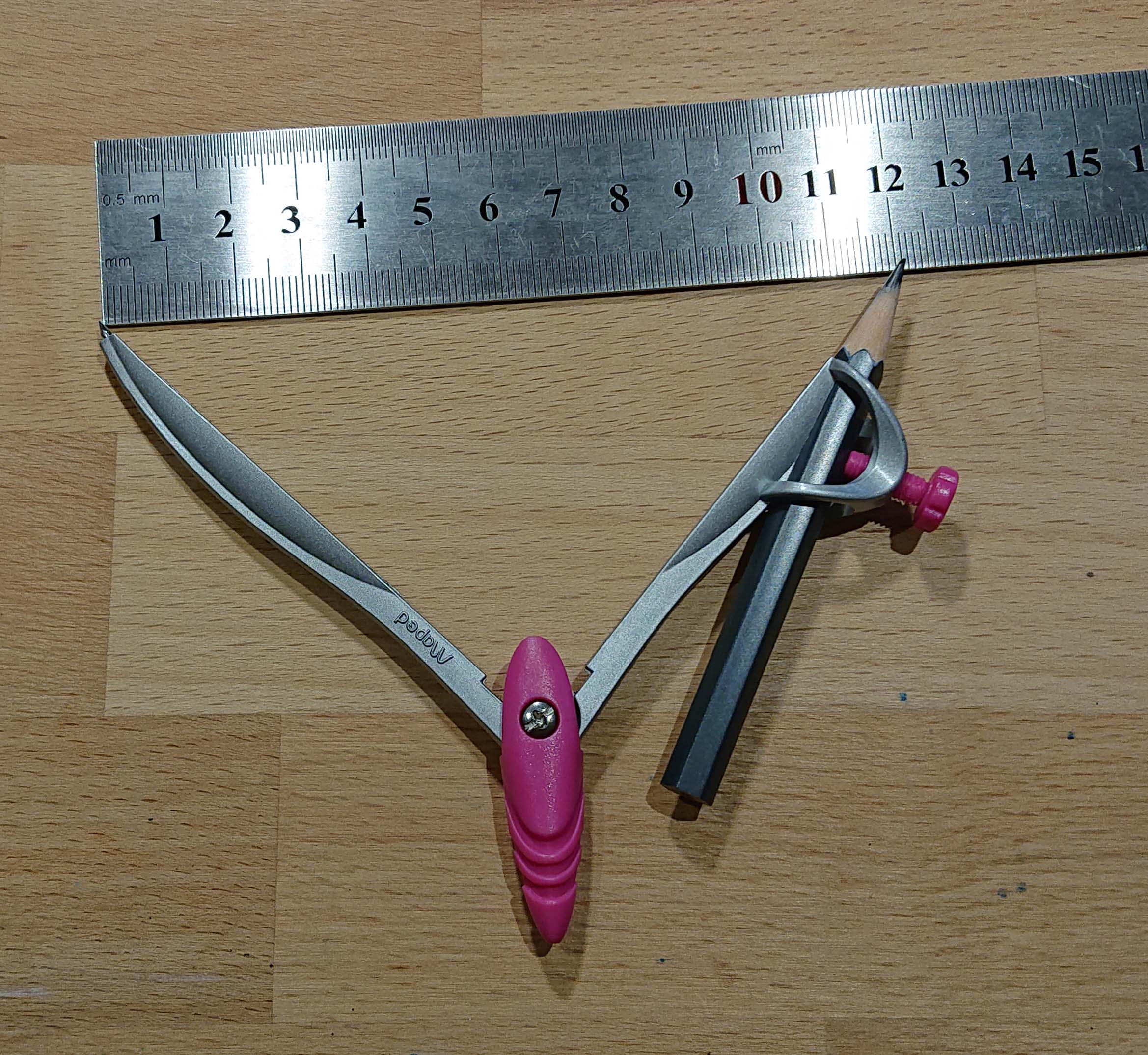 Från punkten där bågarna möts till biglinjen gör du nu streck med linjal. Du får då en trekant.