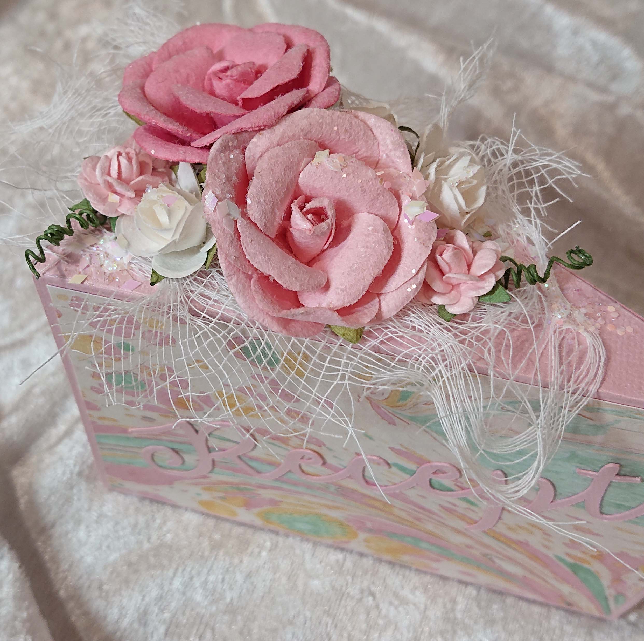 Ovanpå tårtbiten dekorerade jag med ostduk, blommor, glitter och flakes. Blommorna satte jag fast med lim medan glitter och flakes limmades dit med gel medium.
