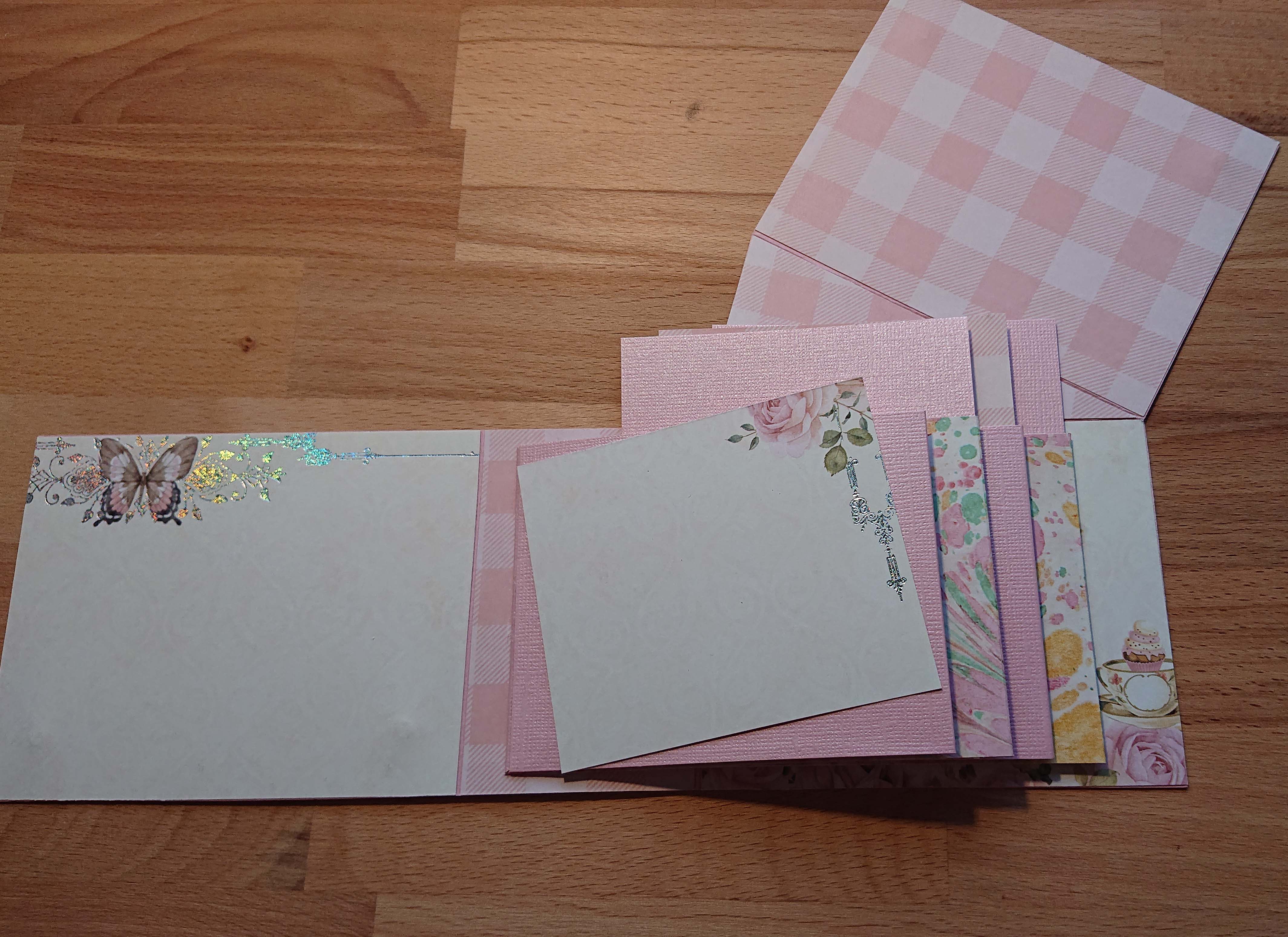 I fickorna satte jag därefter 2 mönsterpapper och två bitar cardstock i storleken 9,5 cm x 8 cm. Dessa mått kan behöva justeras utifrån hur stora era fickor blir. Jag vill att hon ska få plats med många recept och genom dessa extrablad tycker jag att hon får den möjligheten.