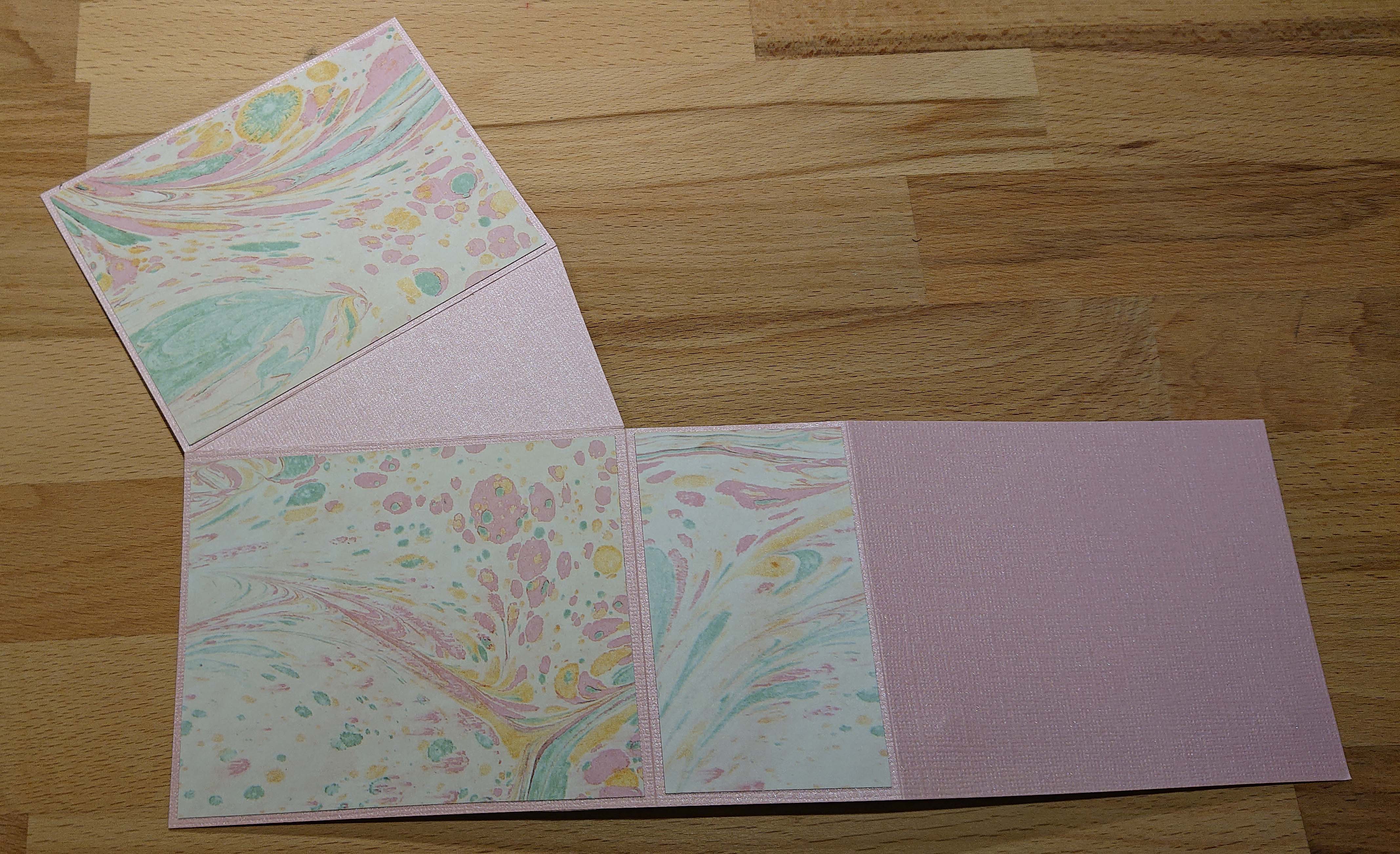 Nu kan du börja sätta fast mönsterpapperet på insidan. Du behöver en bit som är 12 cm x 5,8 cm och 3 bitar som är 12 cm x 9,5 cm. För att få en lagom bit till trekanten la jag den på mönsterpapperet och markerade ut hur stor den var. Det som blev över klippte jag helt enkelt bort efter att jag satt fast den på cardstocken.