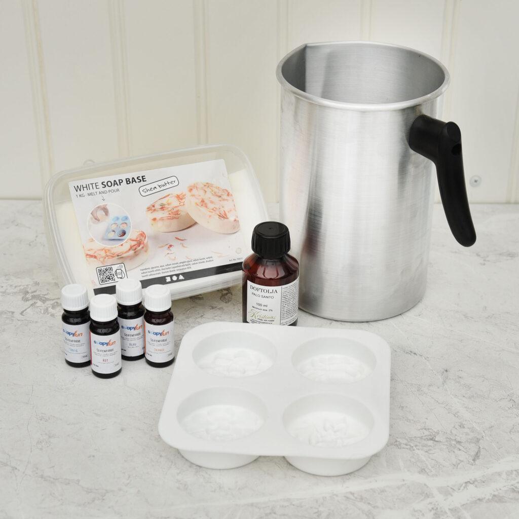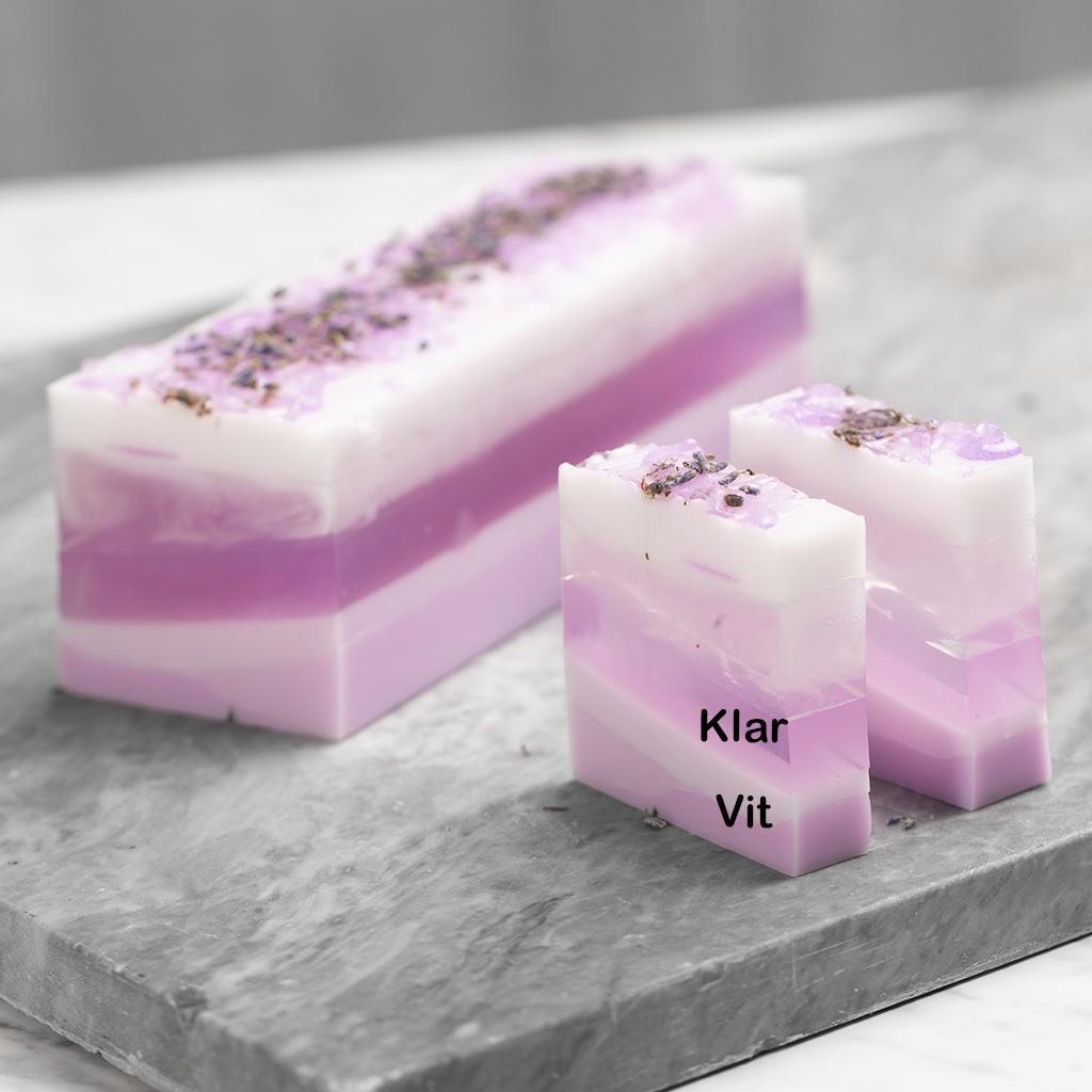 Du behöver en tvålbas. Välj mellan vit eller klar. Tillsätter du tvålfärg i vit tvålbas blir den helt genomfärgad, medan klar tvålmassa blir transparent. För en läcker effekt kan du varva klar och vit tvålbas i olika lager.