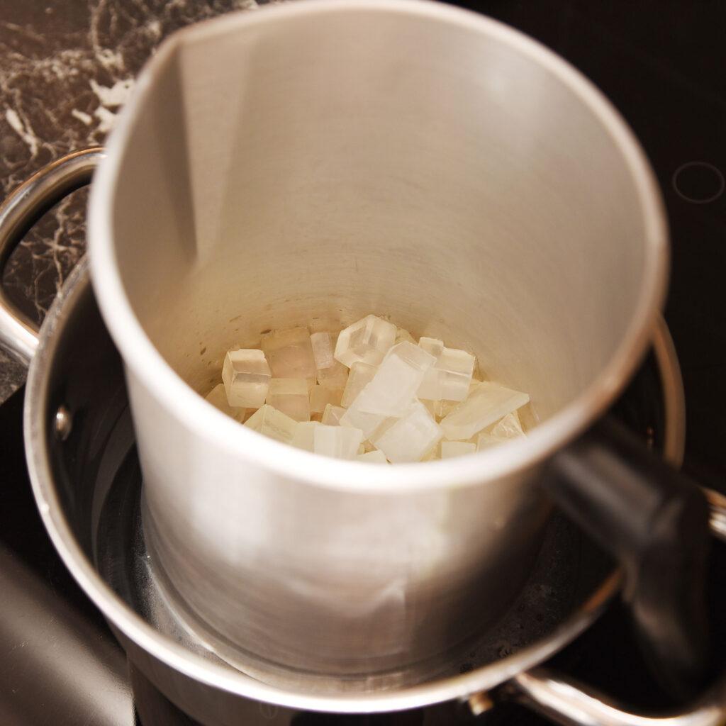 2. Smält alltid tvålmassan i vattenbad på spisen, eller i ett värmekärl. Ha ganska låg värme, tvålmassa ska aldrig börja koka.