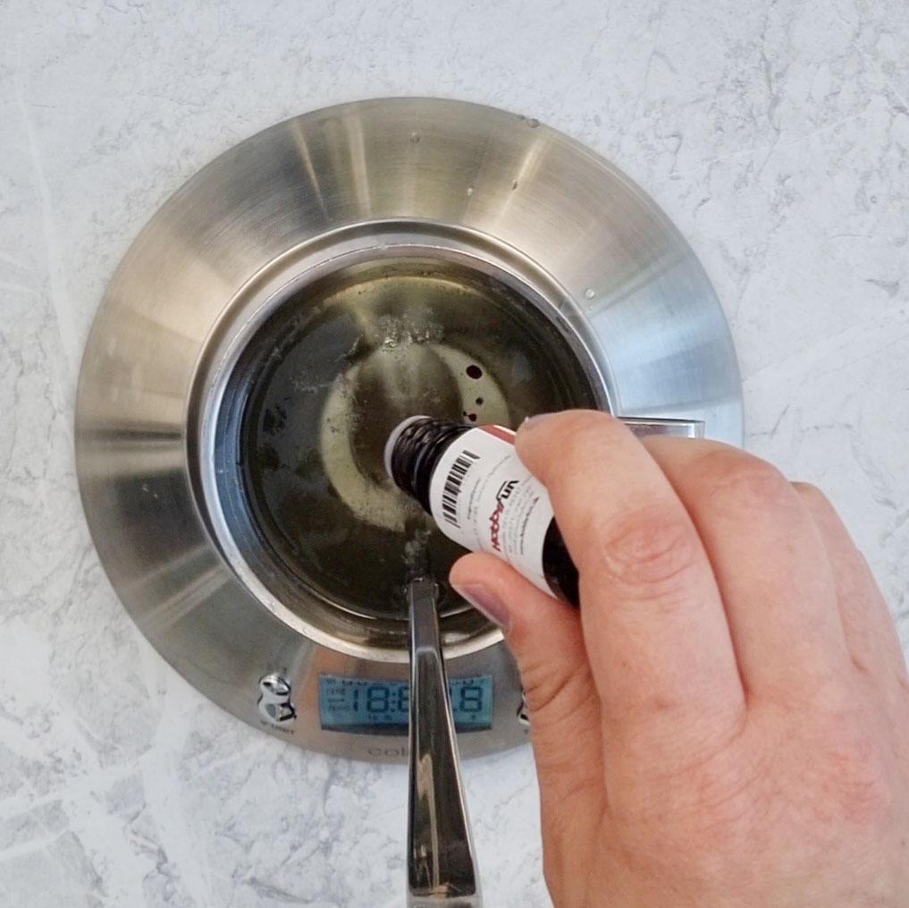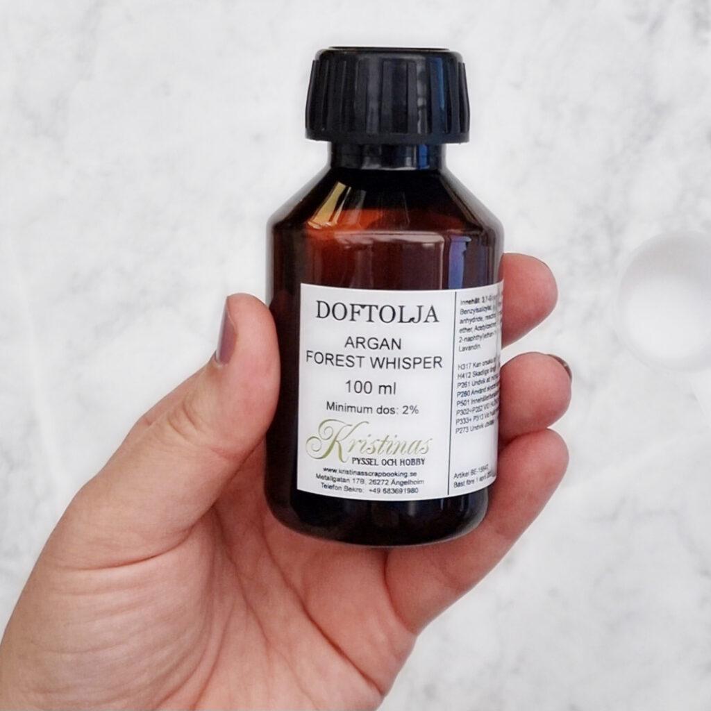 3. Tillsätt doftolja. Jag har valt ”Argan Forest Whisper” som innehåller doftnoter av mandel, honung och vanilj.