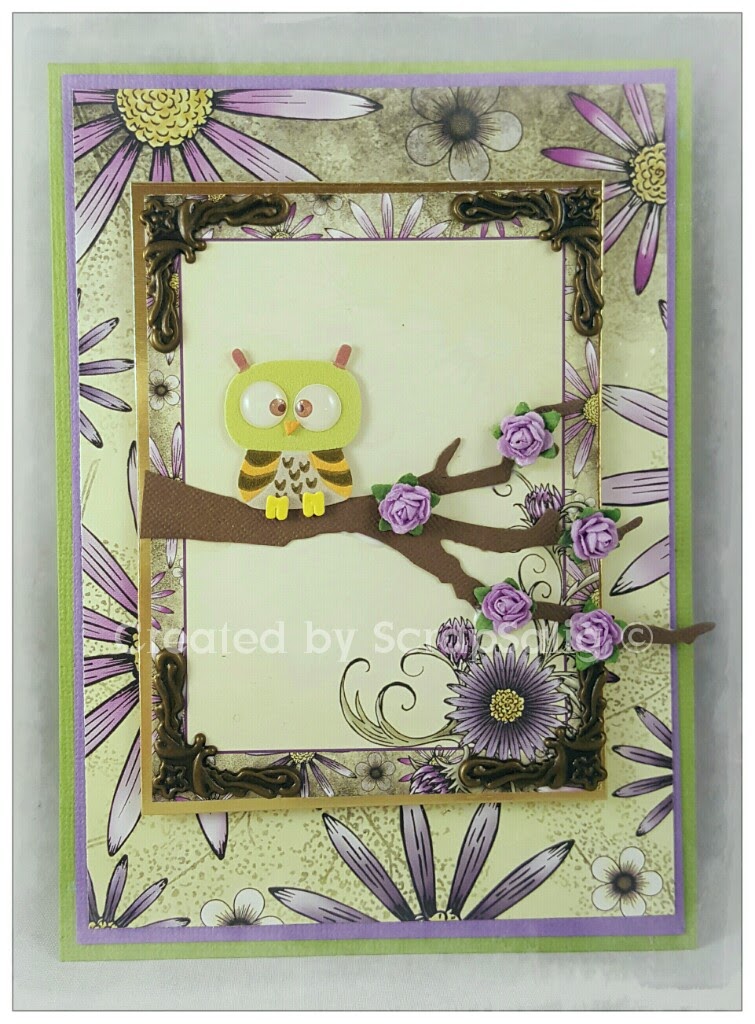 Lager på lager med designark och cardstock ger en lyxig känsla tillsammans med metallhörn. Kvisten som ugglan vilar på är en del av en träd-die från Tim Holtz (privata gömmor) och med pyttesmå rosor får vi en känsla vårblomning.